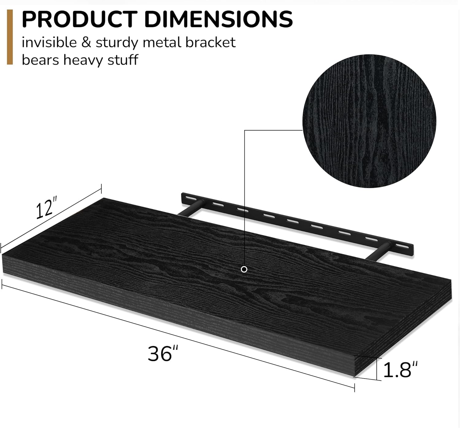 - Extra Deeper & Thicker - Each board measures 36"W x 12"D x 1.8"H. Extra deeper and thicker design in order to bring maximizes storage space and weight capacity, even hold up to 70 lb each. This floating shelf taking up zero square feet, reduces clutter and highlights décor in compact spaces.