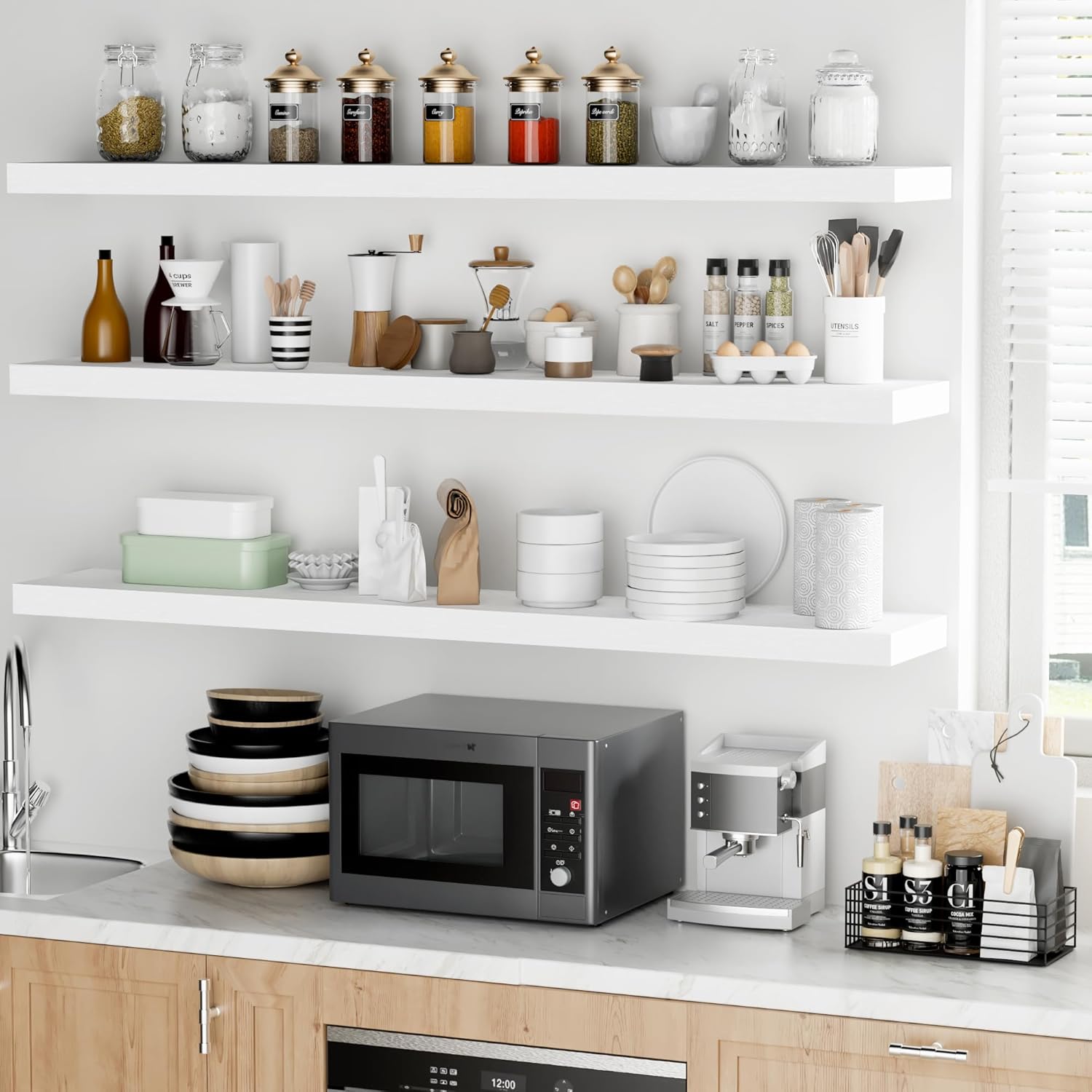 - Versatile & Multi-Scene Functionality: Our floating shelves are available in a variety of sizes and thicknesses, allowing you to choose the perfect fit for your space. Use them in the bathroom to store beauty products, hair care items. In the bedroom, they can hold books, cosmetics, and personal items. In the kitchen, they’re perfect for spices, jars, or small utensils. Or display photo frames, trophies, or collections in the living room. These shelves efficiently use wall space to create a tidier, more spacious feel in any room.