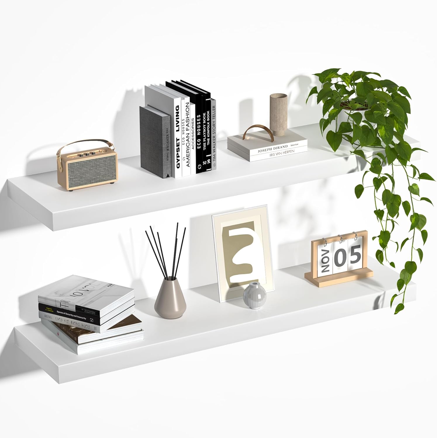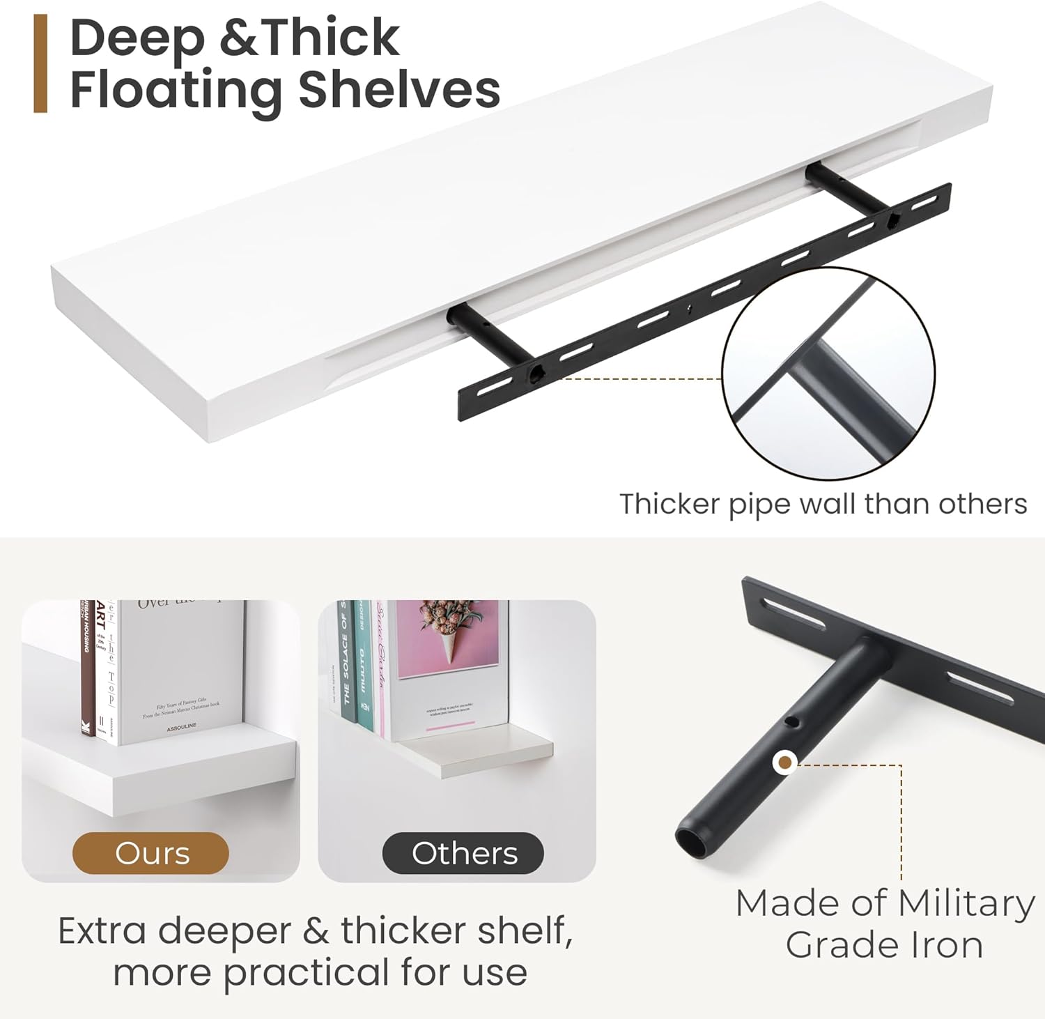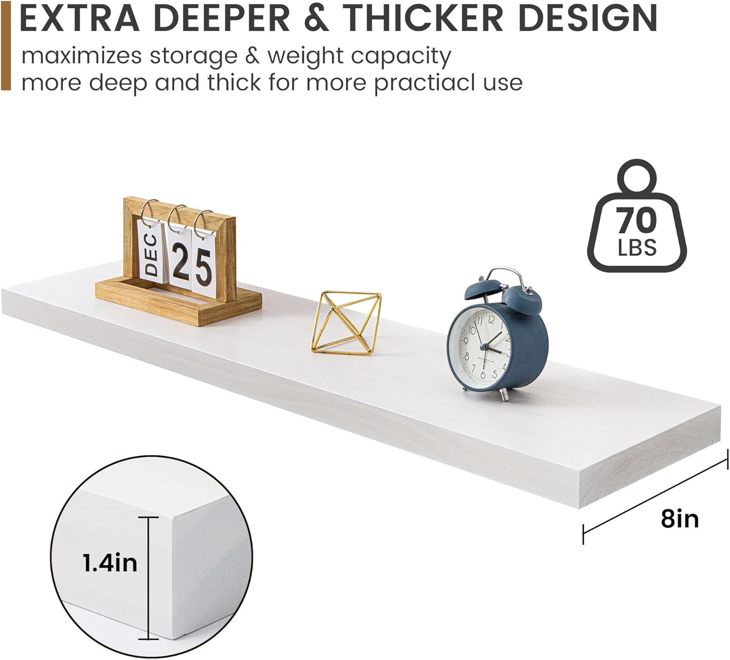 - Extra Deeper & Thicker for Storage - Each board measures 30"W x 8"D x 1.4"H. Extra deeper and thicker design in order to bring maximizes storage space and weight capacity, even hold up to 70 lb. This floating shelf taking up zero square feet, reduces clutter and highlights dΓ©cor in compact spaces. It can help make full use of the empty wall, making it much more space-saving and making your room look larger and tidier.