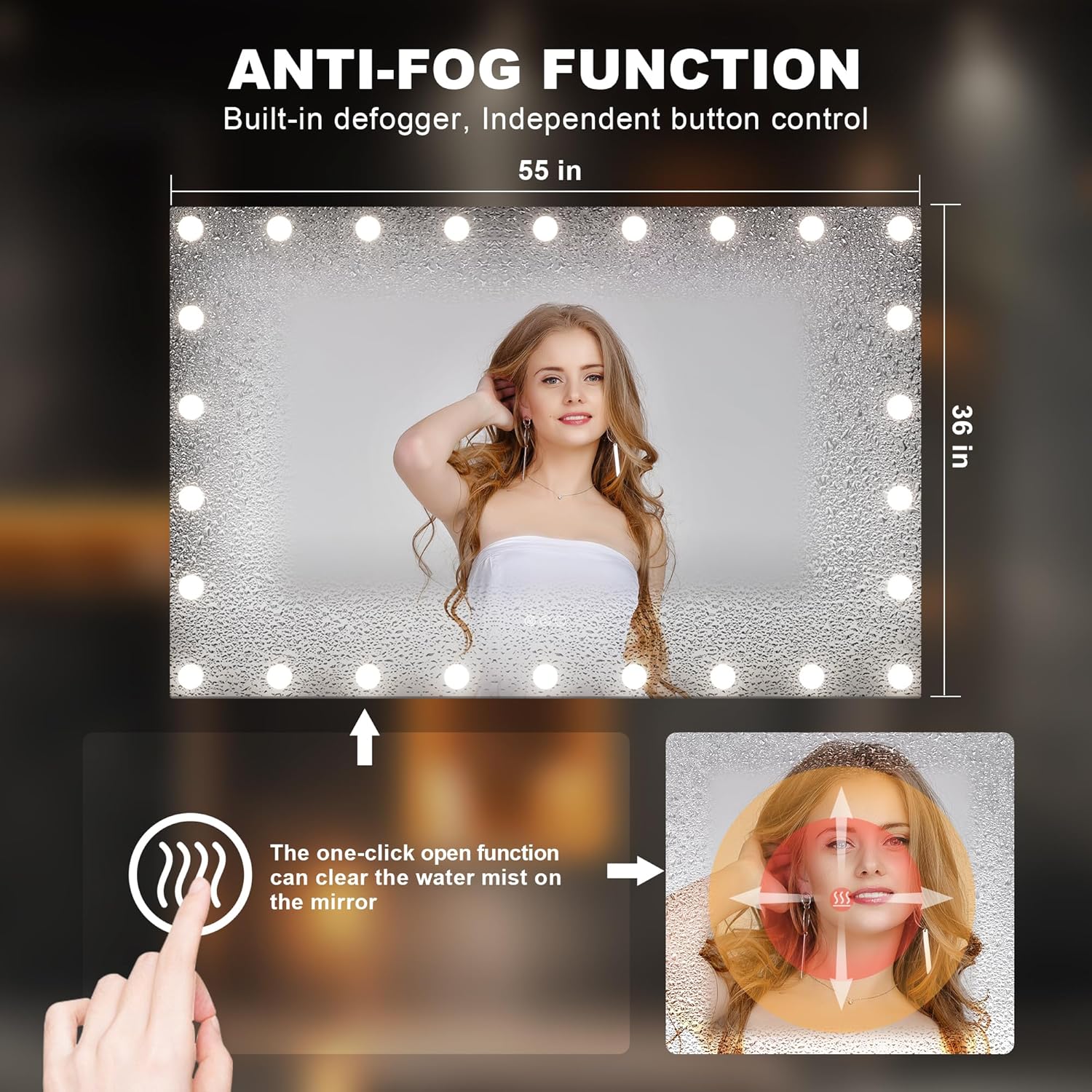 Hasipu LED Bathroom Mirror with Lights, 55" x 36" Hollywood Wall-Mounted Bathroom Mirror with 26 Dimmable Bulbs, 3 Colors Modes, Touch Control, Anti-Fog, Memory Function, Shatter-Proof, ETL Listed