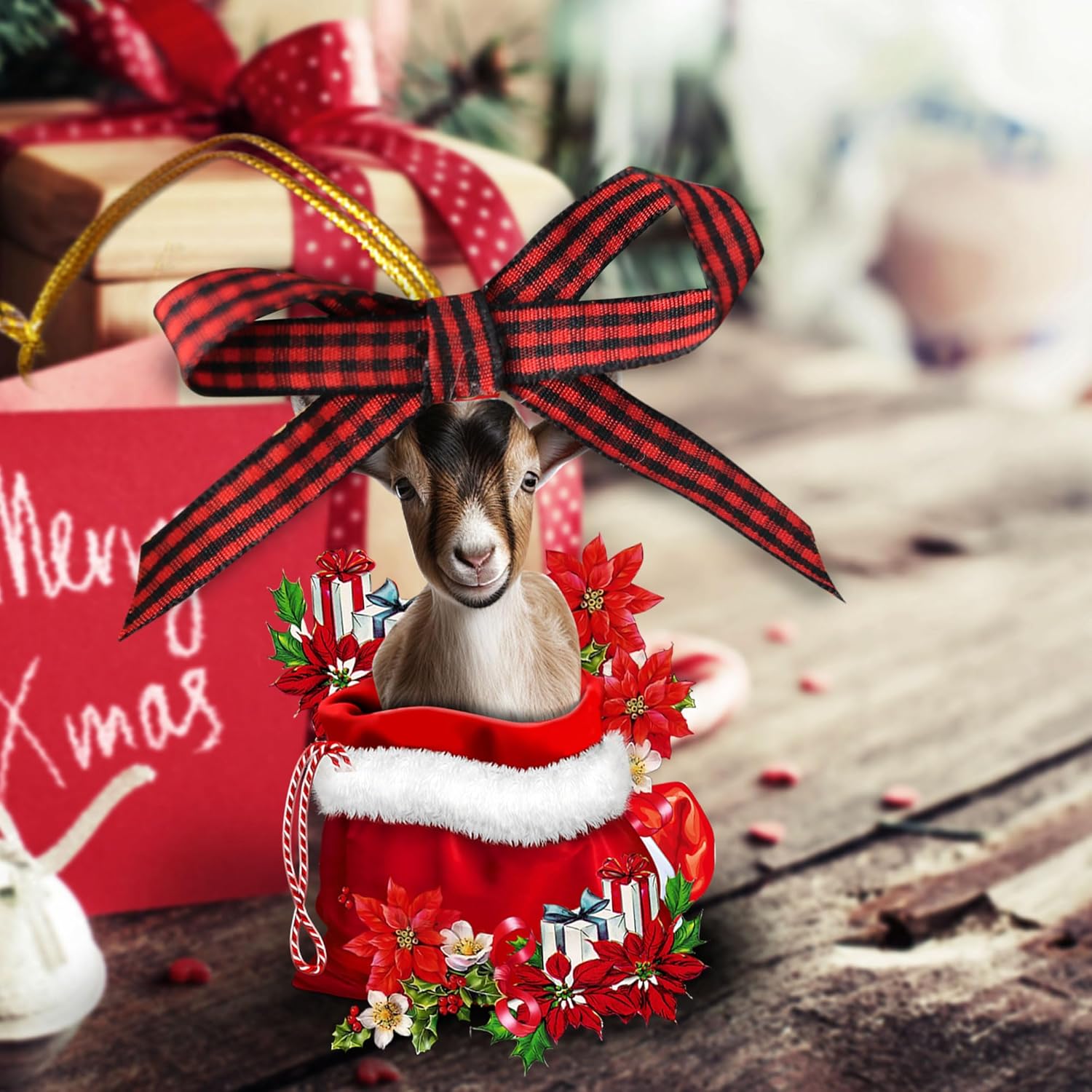 Talataca Goat 2D Flat Wooden Christmas Ornament, Goat Farm Animal in Red Santa Gift Bag Pine Tree Decor, Hanging House Charm Eve Keepsake, Wood Car Mirror Accessories, Xmas Gift