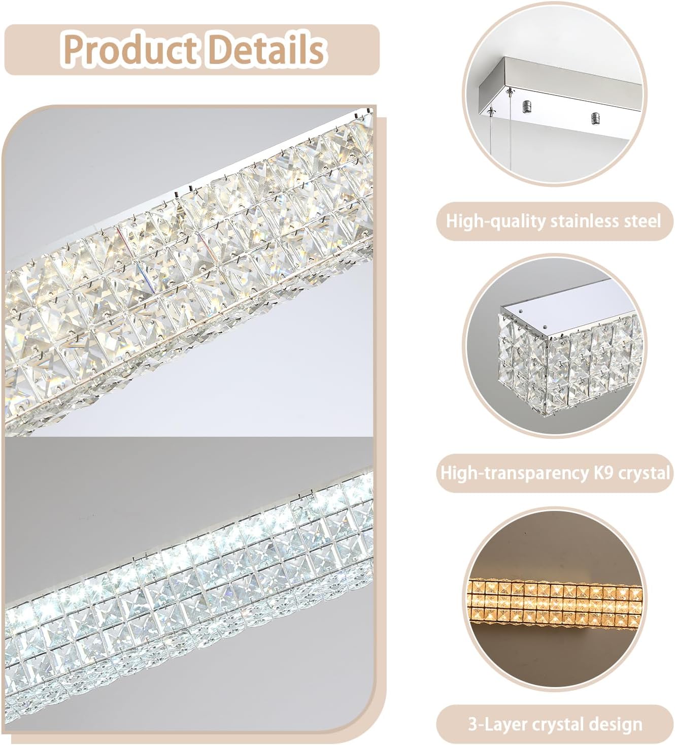 • 【Modern Chandelier Design】:The light body is crafted from exquisite circles of stainless steel and high-quality K9 crystal, adorned with a stunning embellishment on the top. It exudes a radiant and sophisticated aura, infused with a touch of contemporary allure.