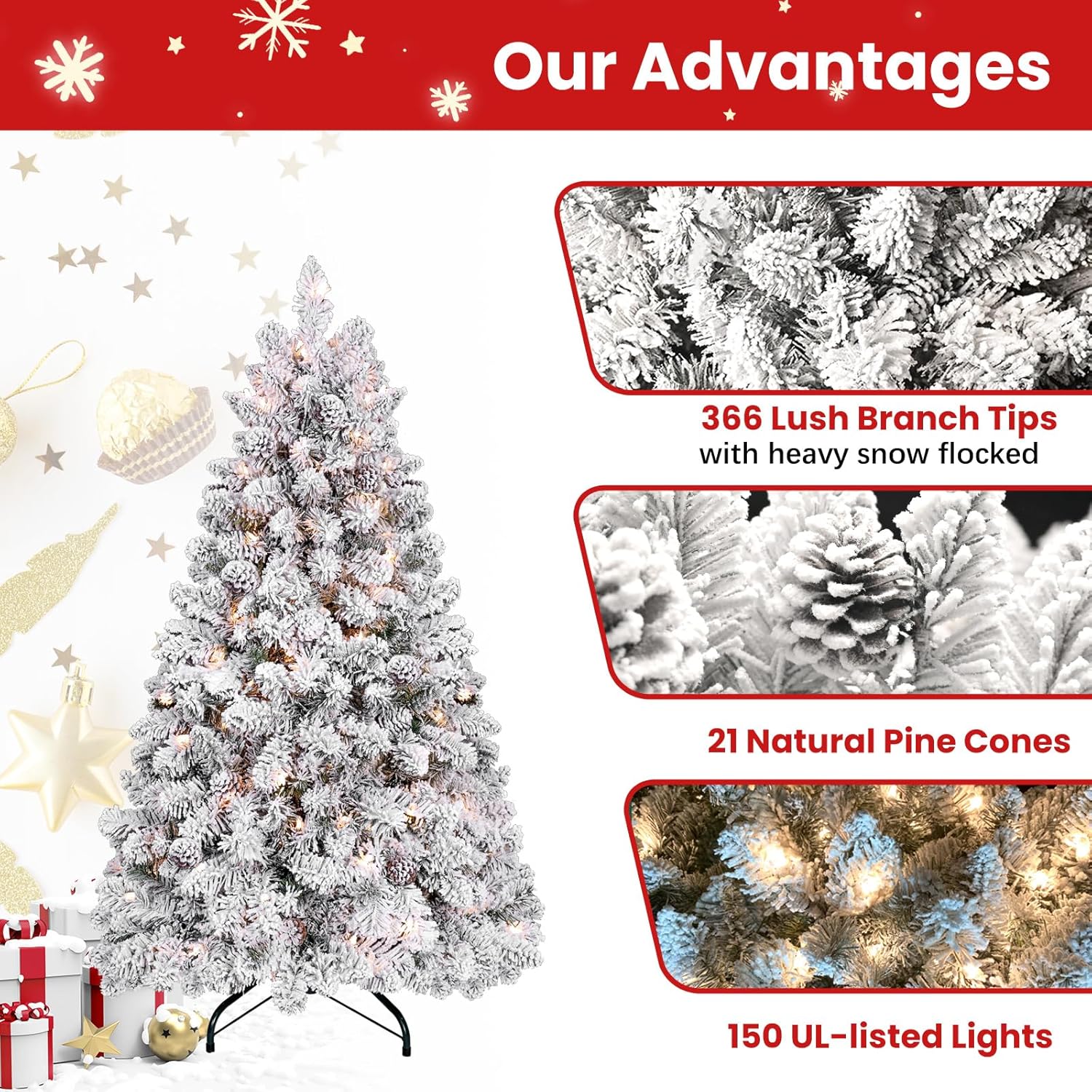 4 ft Prelit Flocked Christmas Tree with Pine Cones & 150 UL Lights, Snow Frosted Artificial Christmas Tree with Auto Hinged Stand for Holiday Decor