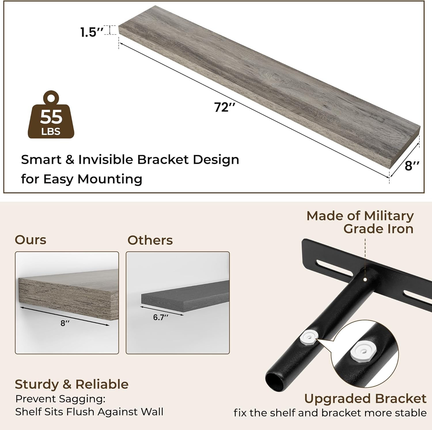 - Easy To Assemble: This floating shelves not only come with stainless-steel galvanized invisible brackets, but also equipped a fixing screw at the bottom to fix the shelf on the support rod, which solves the problem of sliding and is not easy to damage, and can be used for a long time. Instructions, magnetic level, drywall anchors, and screws included. This is great because you can easily mount these rustic shelves Gap-Free to any surface in less than 10 minutes