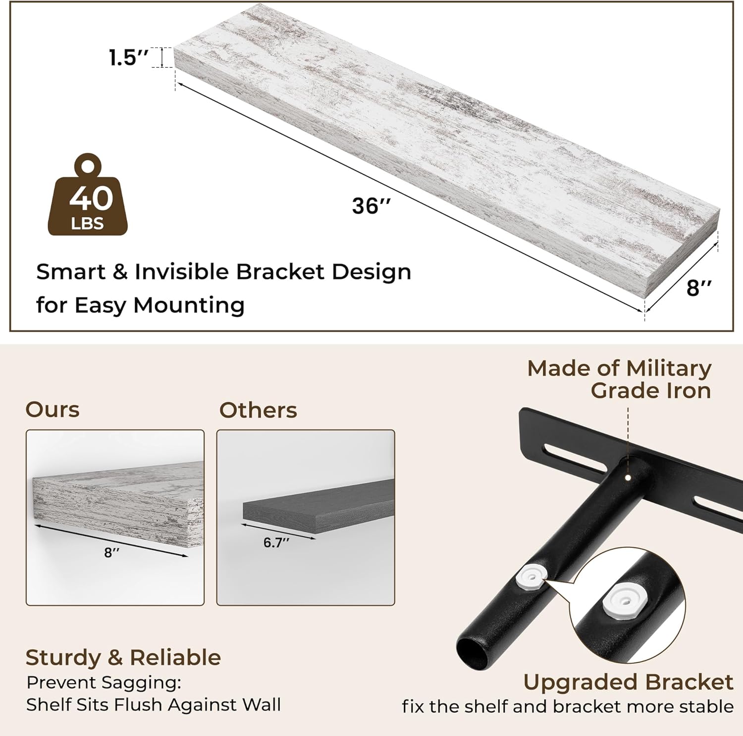 - Easy To Assemble: This floating shelves not only come with stainless-steel galvanized invisible brackets, but also equipped a fixing screw at the bottom to fix the shelf on the support rod, which solves the problem of sliding and is not easy to damage, and can be used for a long time. Instructions, magnetic level, drywall anchors, and screws included. This is great because you can easily mount these rustic shelves Gap-Free to any surface in less than 10 minutes