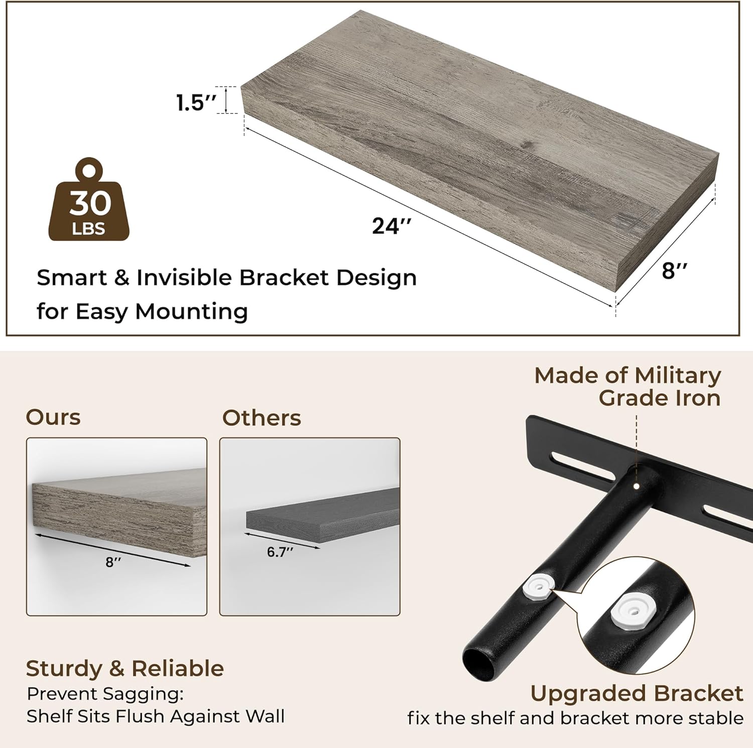 - 24 Inch Floating Shelves for Wall (Set of 2): Each wall shelves are 8 inches in depth and 1.5 inches in thickness. 2-piece set is more cost-effective and practical. Our wall shelf can be used in combination, staggered high or low on the wall, or mounted side-by-side to provide extra storage space for organizing small items and clutter in multiple areas such as kitchens, bathrooms, and bedrooms, creating a clean and smooth look. Multiple colors available
