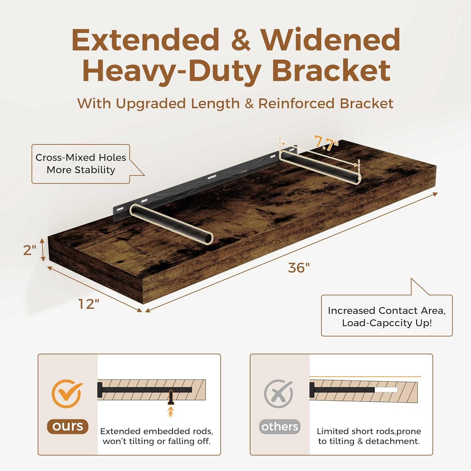 Floating Shelves 36 Inch Long, 12 Inch Deep Floating Shelves for Wall, 36 x 12 Shelves for Wall Storage & Display, 2" Thick Floating Shelf for Bathroom, Living Room, Rustic Brown Color, Set of 2