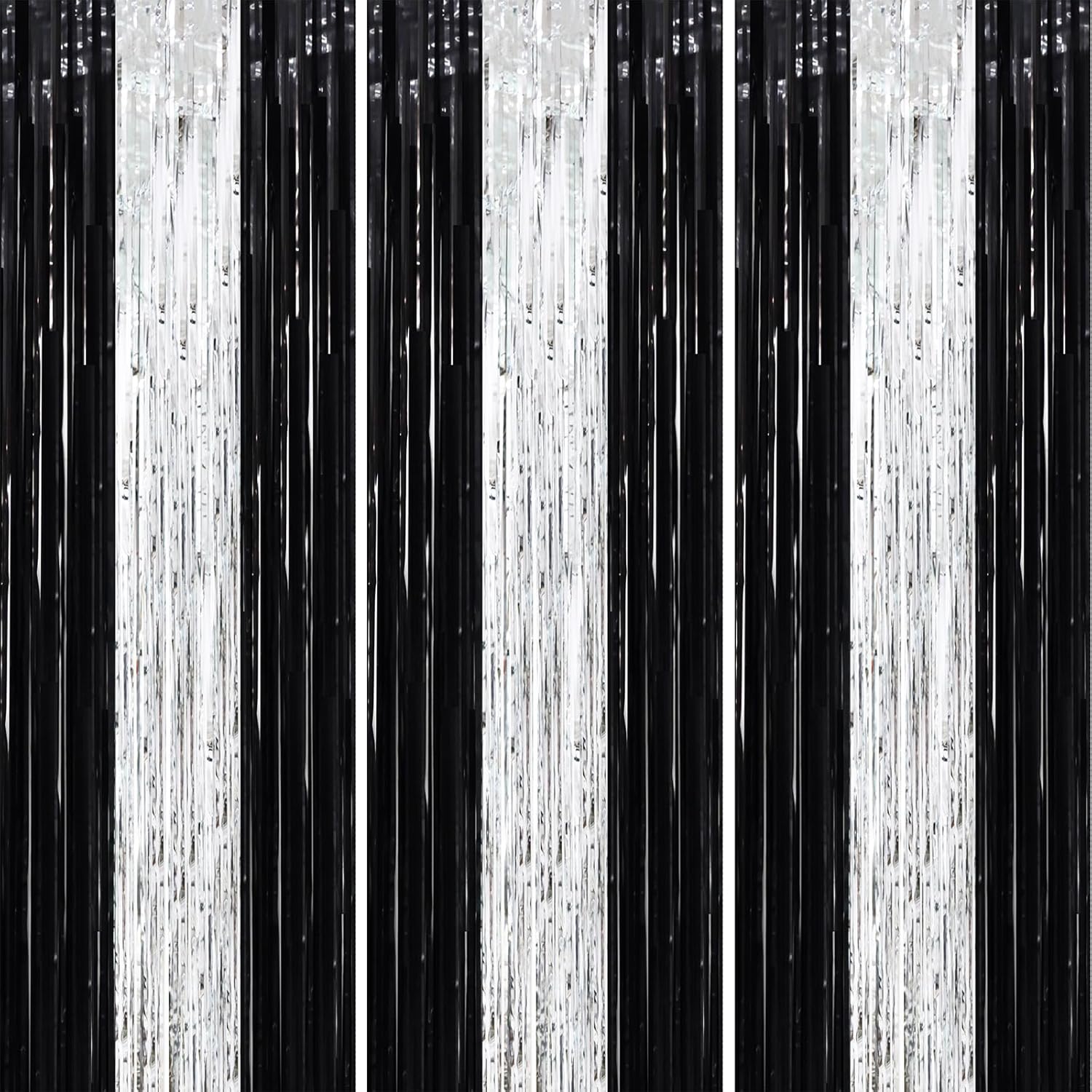 3 Pack 3.3 x 8.2 ft Black and Silver Foil Fringe Backdrop Curtains, Tinsel Streamers Party Decorations, Fringe Backdrop