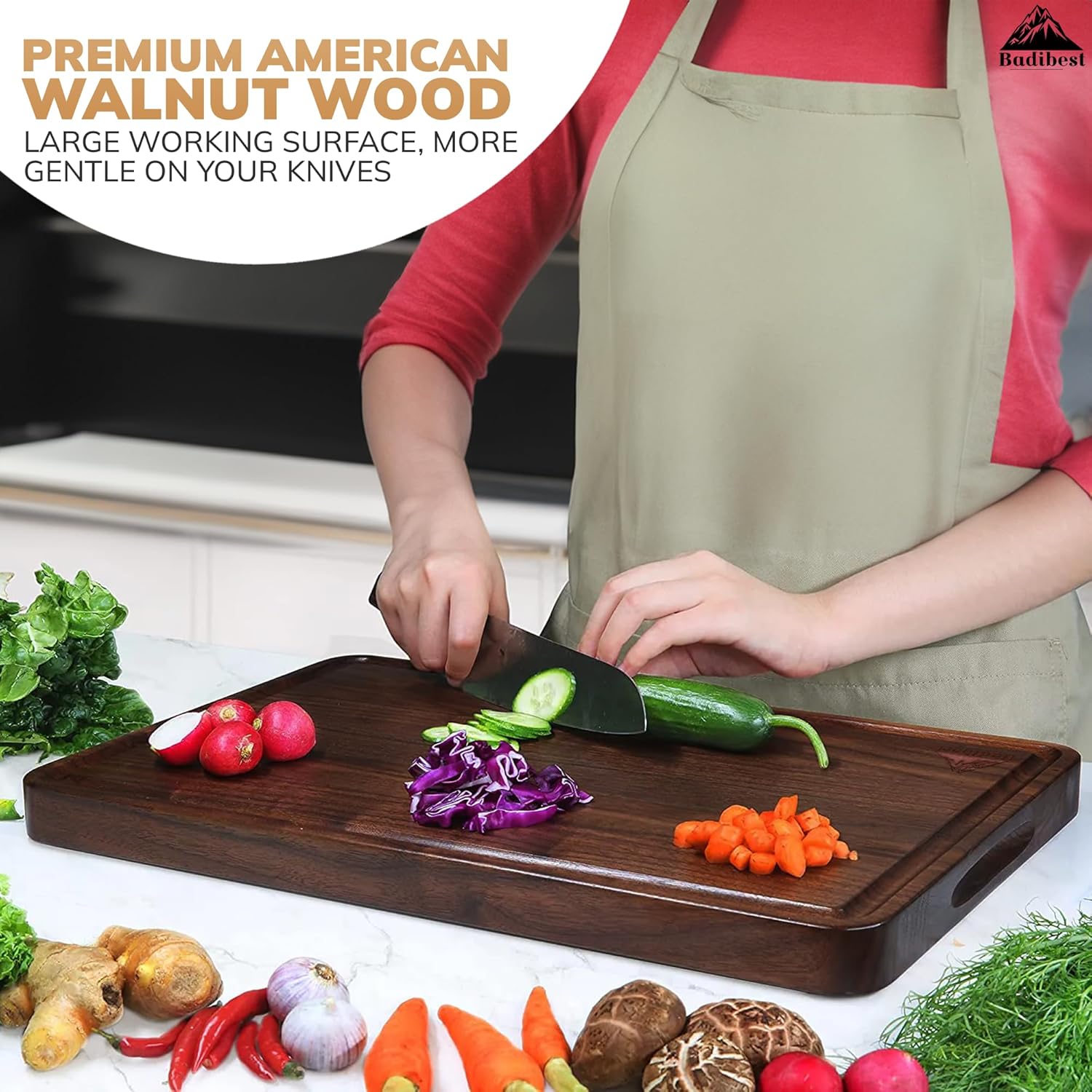- 【𝐅𝐨𝐨𝐝-𝐒𝐚𝐟𝐞 & 𝐄𝐜𝐨-𝐅𝐫𝐢𝐞𝐧𝐝𝐥𝐲 – 𝐍𝐚𝐭𝐮𝐫𝐚𝐥𝐥𝐲 𝐍𝐨𝐧 𝐓𝐨𝐱𝐢𝐜】: Finished with 100% food-grade mineral oil and free from harmful chemicals, our cutting boards non toxic are safe for all food types. Sustainably sourced walnut and eco-conscious craftsmanship make our wood cutting boards for kitchen a smart, healthy choice for any kitchen.
