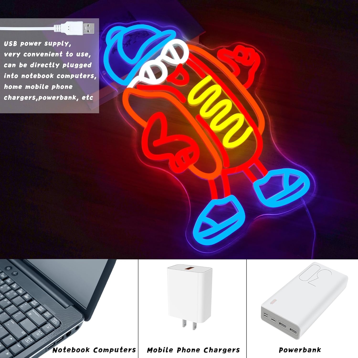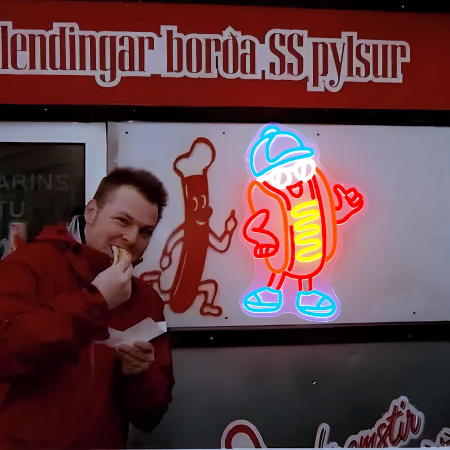 - Unique Baseball Cap Hot Dog Design: This neon sign features a one-of-a-kind cartoon hot dog character wearing a baseball cap, perfect for adding a quirky and fun touch to your decor.