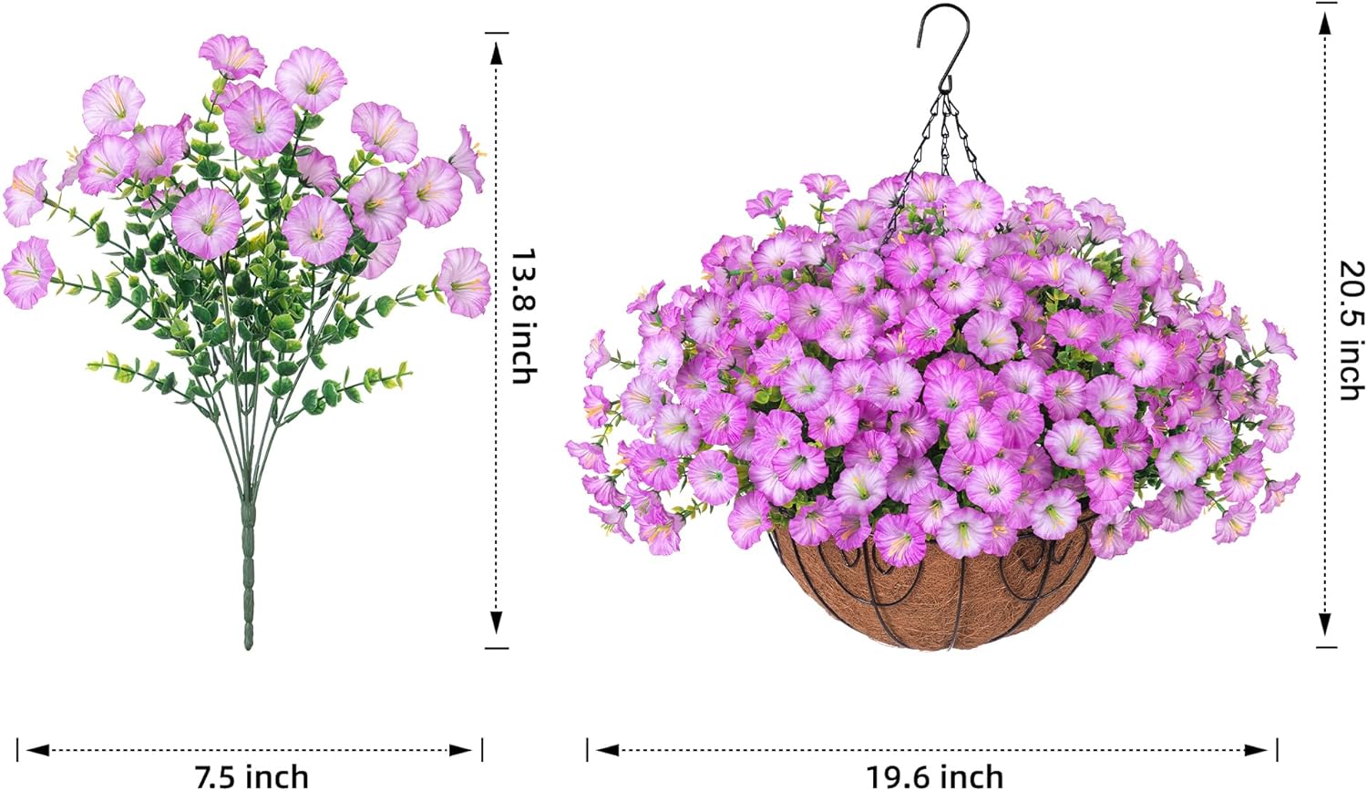 - š¢ Artificial Hanging Morning Glory Flowers Basket: Package include 12 bundles Realistic silk morning glory match with green eucalyptus leaves, 1 Hanging Basket with chain, 1 foam, 1 green hat. Enjoy vibrant blooms year-round, regardless of the season or weather conditions.