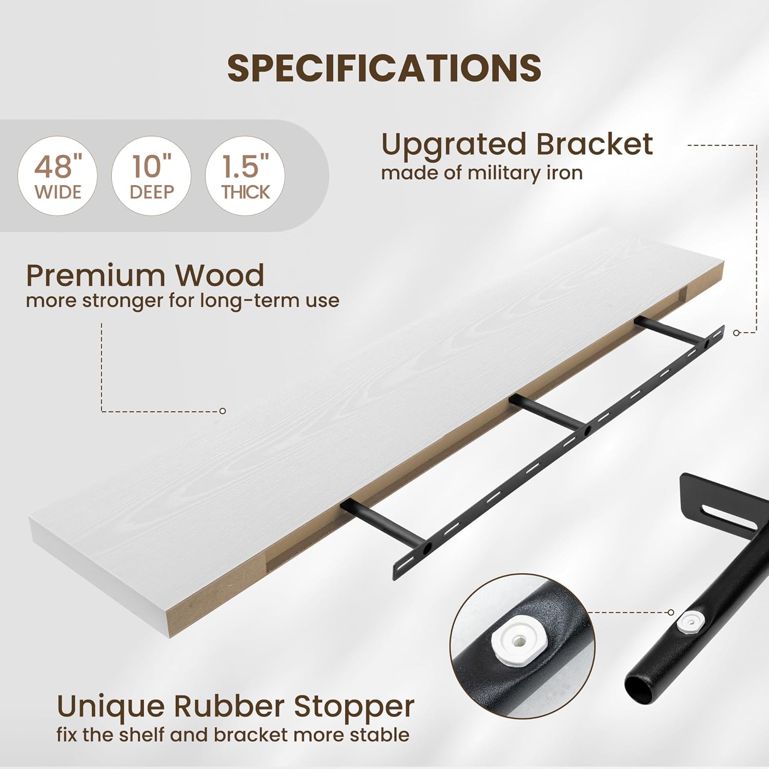 - INVISIBLE & STURDY BRACKET: This floating shelf features a simple and elegant design with an invisible bracket that creates a floating effect. The sturdy hidden support and special rubber stoppers ensure the shelf stays firmly in place, offering both strength and a clean, modern style