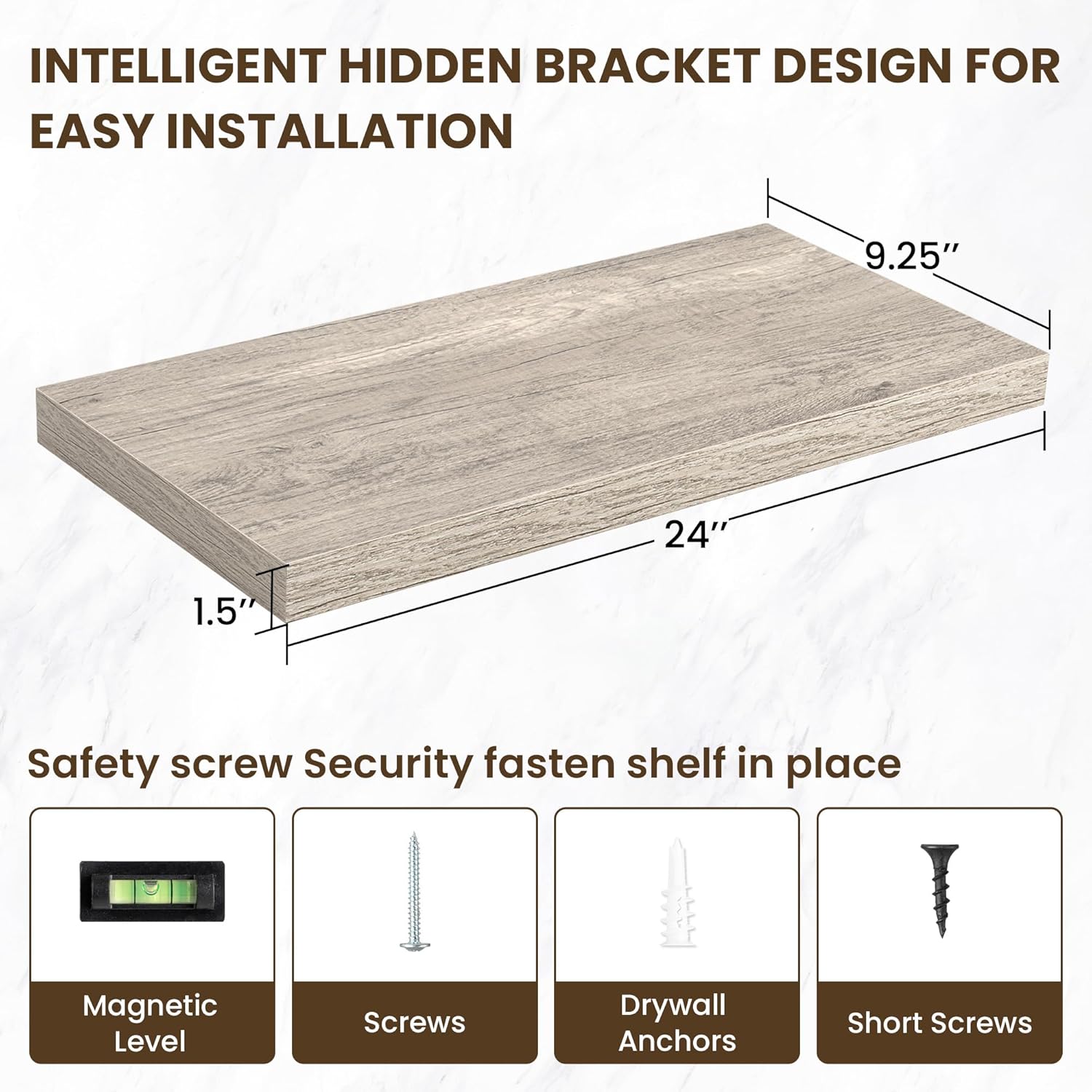24 Inch Floating Shelves, 3D Textured Wood Grain, 24"x9.25"x1.5" Inch Deep Floating Shelves for Wall, Wooden Shelves for Bathroom, Bedroom, Living Room, Vintage Gray Oak