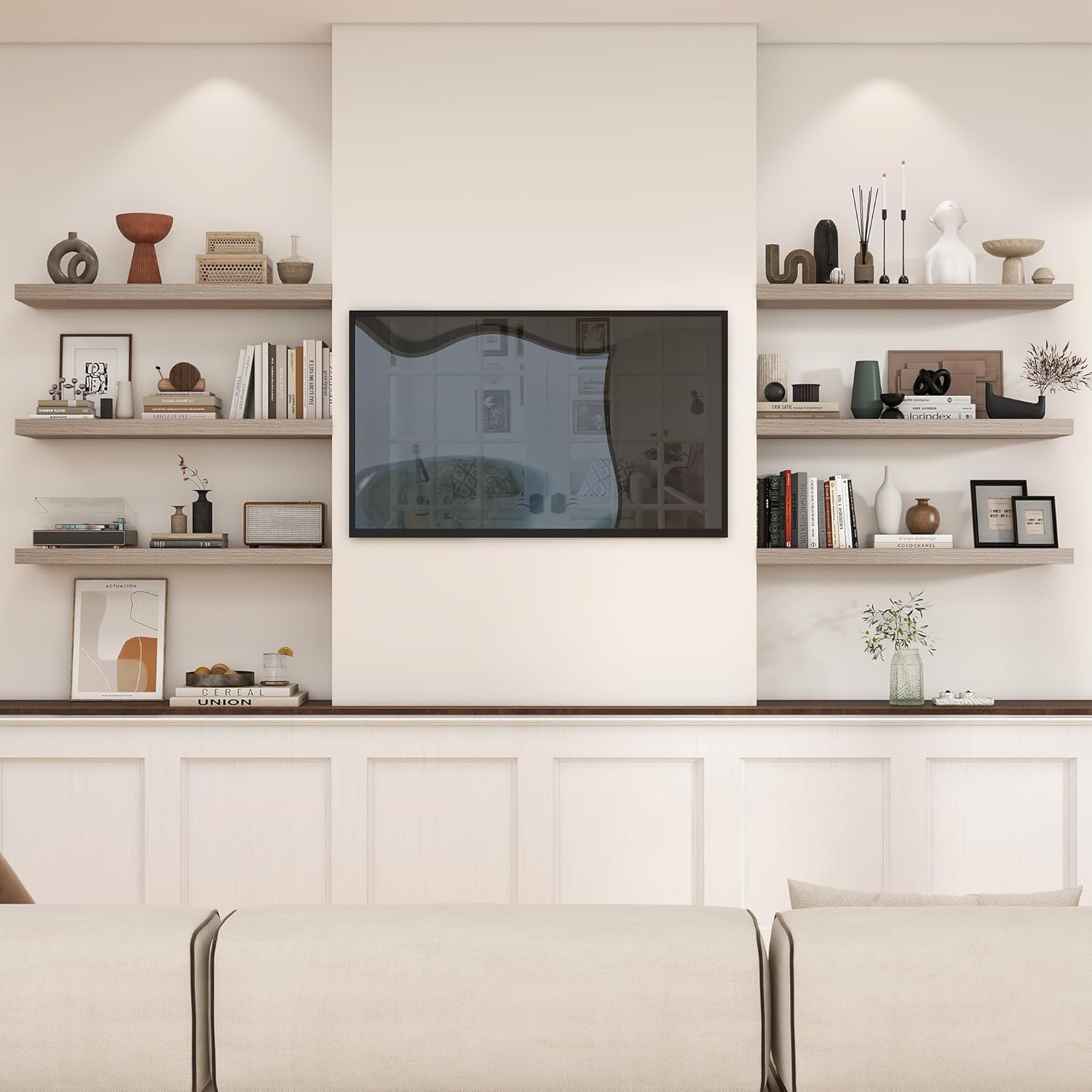 - 【Thickened and widened board】The size of each board is 36"W x 10.23"D x 1.8"H. Our wall-mounted floating shelves are made of high-quality medium-density fiberboard as the main material, combined with an integrated hidden metal bracket to ensure the stability and durability of the wall-mounted shelves. The shelf can bear up to 22 pounds.