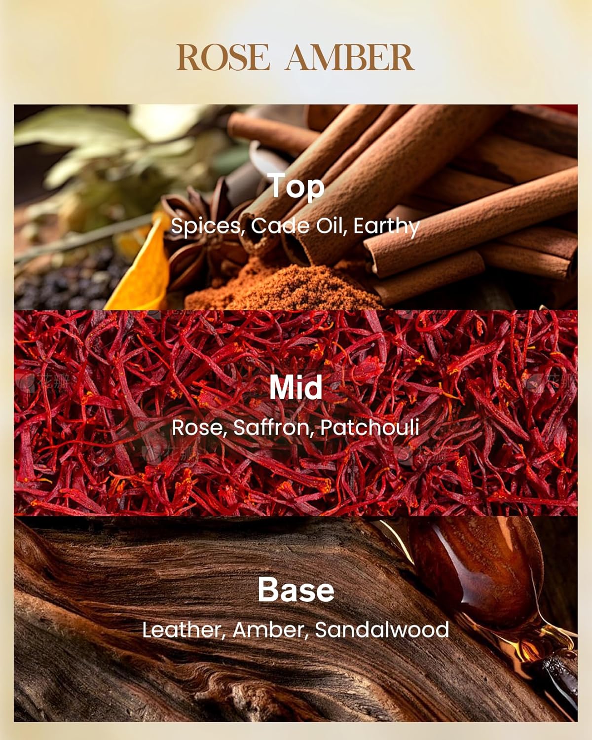 - Scent : amber, rose