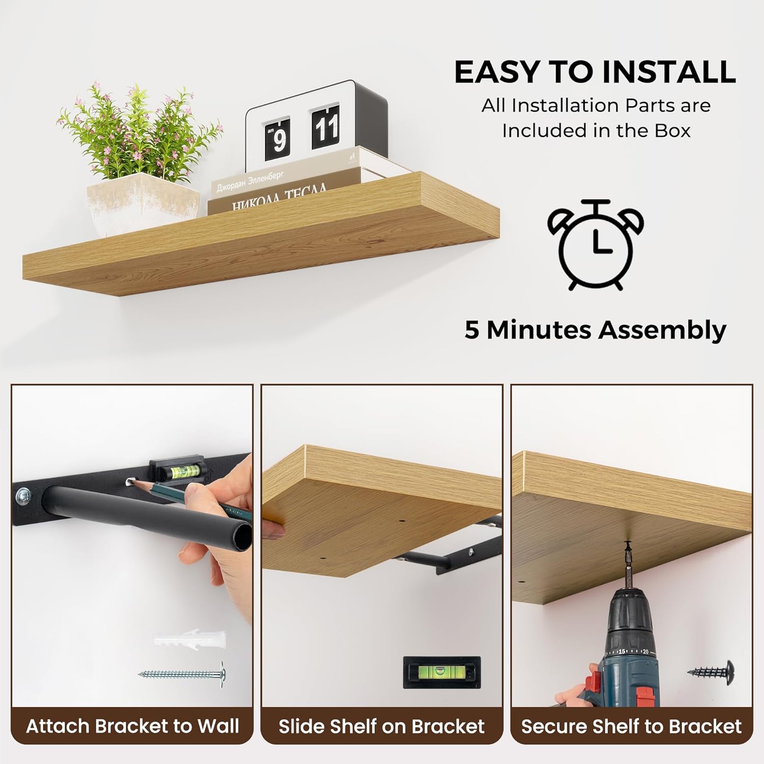 - Easy to install :Our wall floating shelves are designed for easy installation, with detailed instructions that allow you to set them up in just 12 minutes—no professional skills required. The shelves feature a smooth, durable surface. Simply wipe with a damp cloth to keep them looking pristine and clean, offering both convenience and long-lasting functionality.