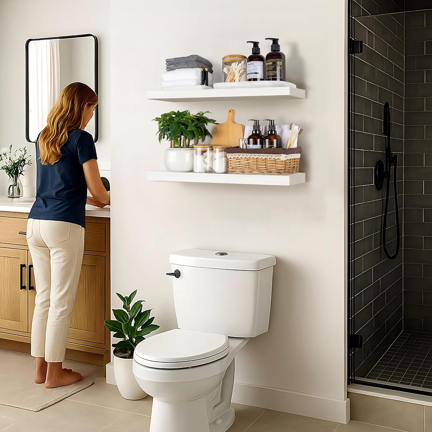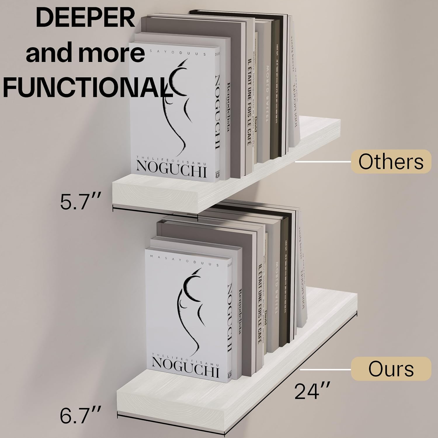 BGMG Wood Floating Shelves 24 inch Long,Rustic Solid Wooden Deep Wall Shelves for Bathroom Living Room Bedroom Kitchen Farmhouse Set of 2-24x6.7x1.25 inch-White