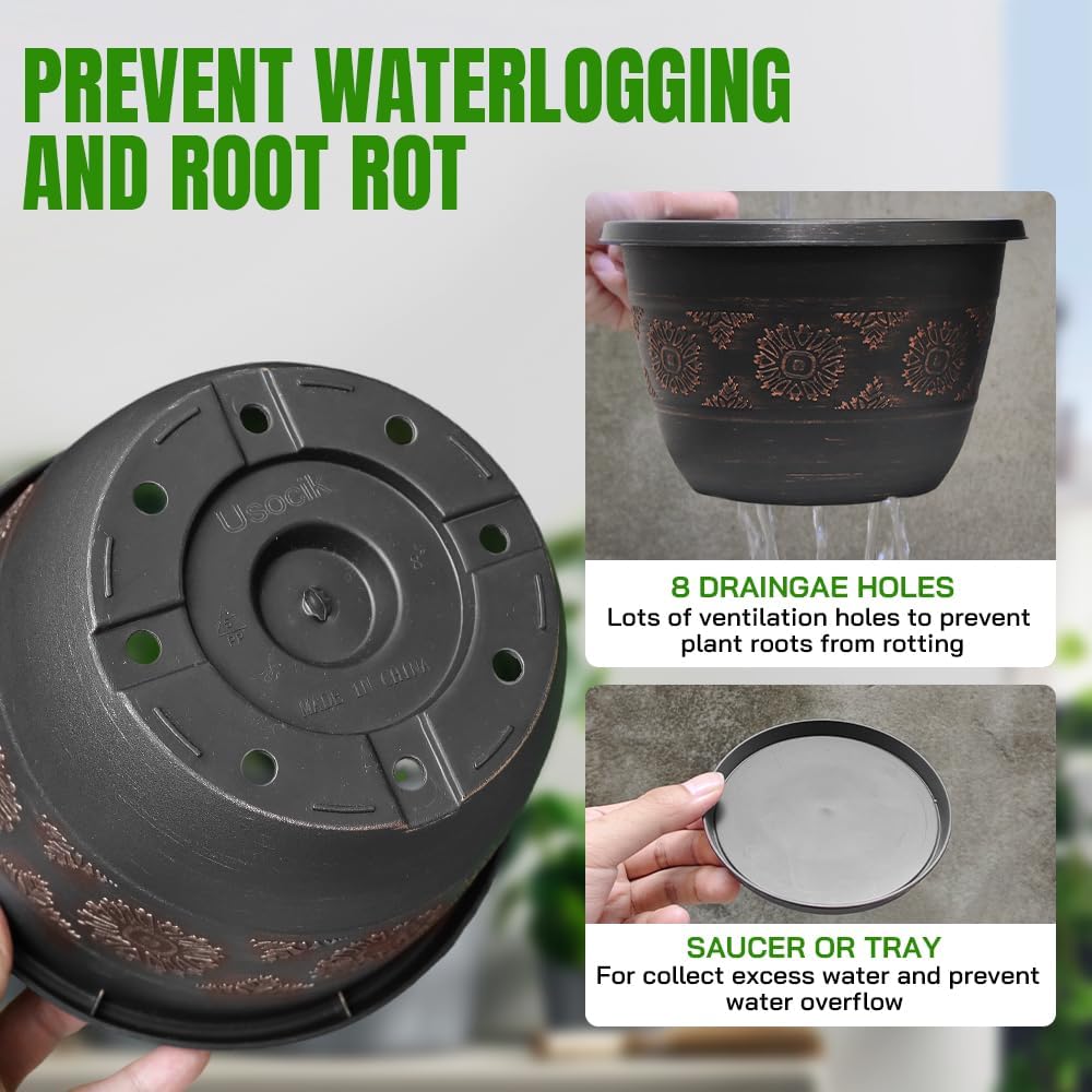 - DRAINAGE HOLE WITH SAUCER β Each garden pot has drainage holes and a saucer. The holes of these plant pots helps protect plants from excess watering. The saucer help to collect excess water and prevent water flowing, keeping the floor dry and clean.