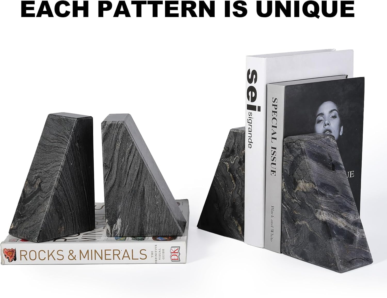 Marble Bookends for Heavy Books, Decorative Book Ends for Shelves, Titanium Black Stone Durable and Heavy-Duty Book Ends for Hardback Books & CDS, Unique Book Stopper & Holder, Set of 2