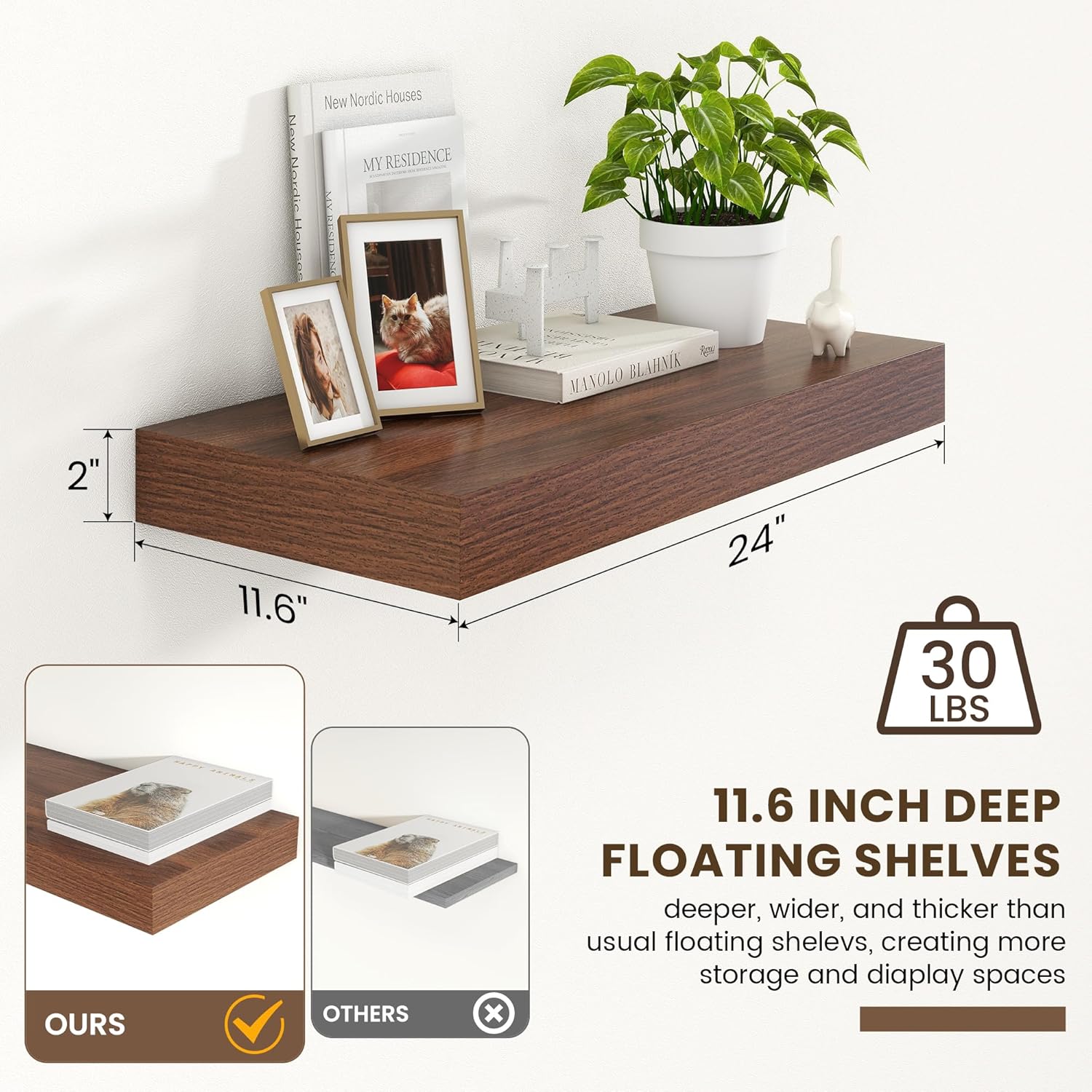 - 12 INCH DEEP FLOATING SHELVES FOR WALL-Elevate your home decor with FLYJOE deep floating shelves, measuring 24 inches wide, 11.6 inches deep, and 2 inches thick. The deeper and thicker design offers unparalleled storage and display possibilities, making them a must-have for any room