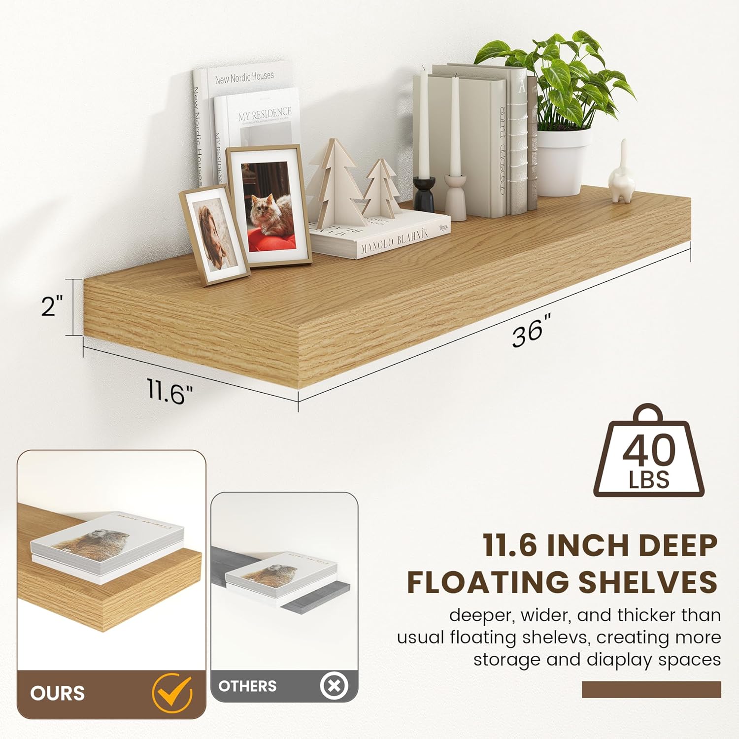 - 12 INCH DEEP FLOATING SHELVES FOR WALL-Elevate your home decor with FLYJOE deep floating shelves, measuring 36 inches wide, 11.6 inches deep, and 2 inches thick. The deeper and thicker design offers unparalleled storage and display possibilities, making them a must-have for any room
