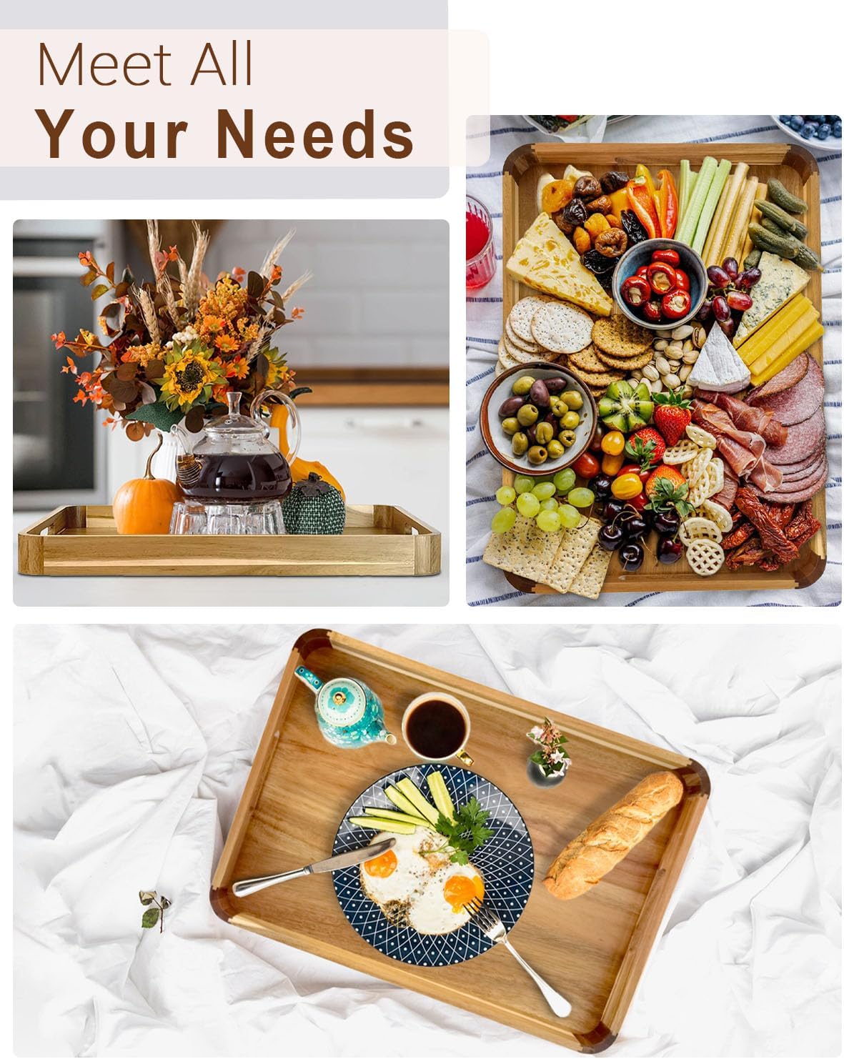 22 Inches Acacia Wood Serving Tray with Handles, Large Wooden Rectangle Ottoman Tray, Nice Home Decor for Living Room Coffee Table Couch, Ideal Size for Serving Food Breakfast BBQ Party