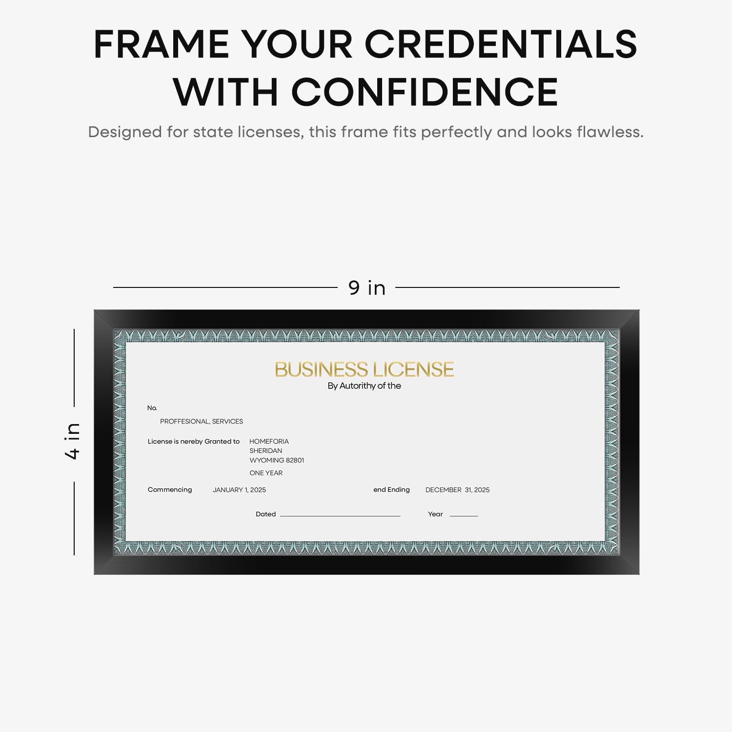 Homeforia 4x9 Business License Frame Black, High End Metal 4 x 9 Certificate Frames with Real Glass, 9x4 Document Frames for Wall or Tabletop, 4 by 9 Picture Frames, Tempered Glass, Wall Kit, Set of 1