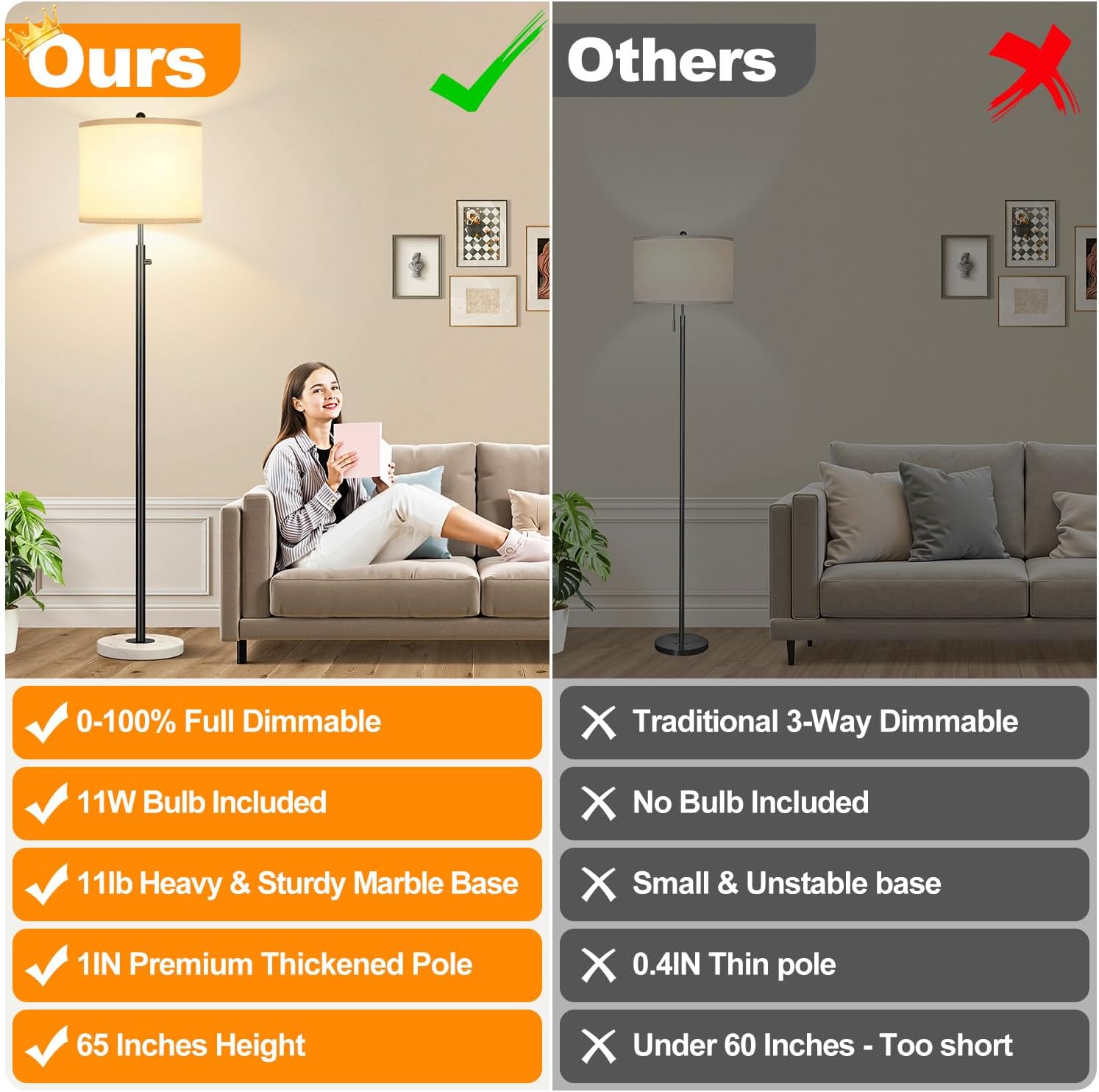 - Stable Marble Base & Space-Saving Design: Our standing lamp features a high-quality marble base for added stability, preventing tipping and ensuring the safety of children and pets. Its space-saving design allows you to place it in any corner or next to furniture like an end table, bedside table, office desk, nightstand, or sofa
