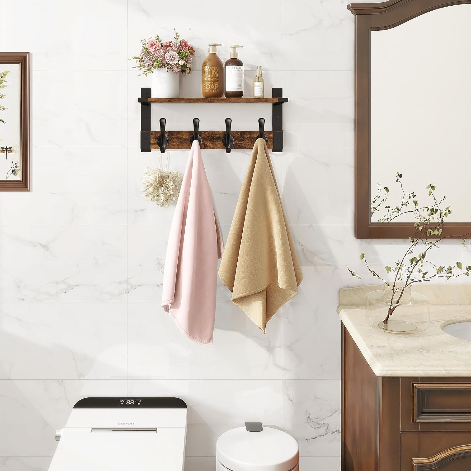 - Versatile Uses: The rustic wood shelf with hooks is seamlessly blending with various home decors, from modern to rustic while ensures all your essentials are organized and easily accessible; Ideal for any space needing a blend of storage and style
