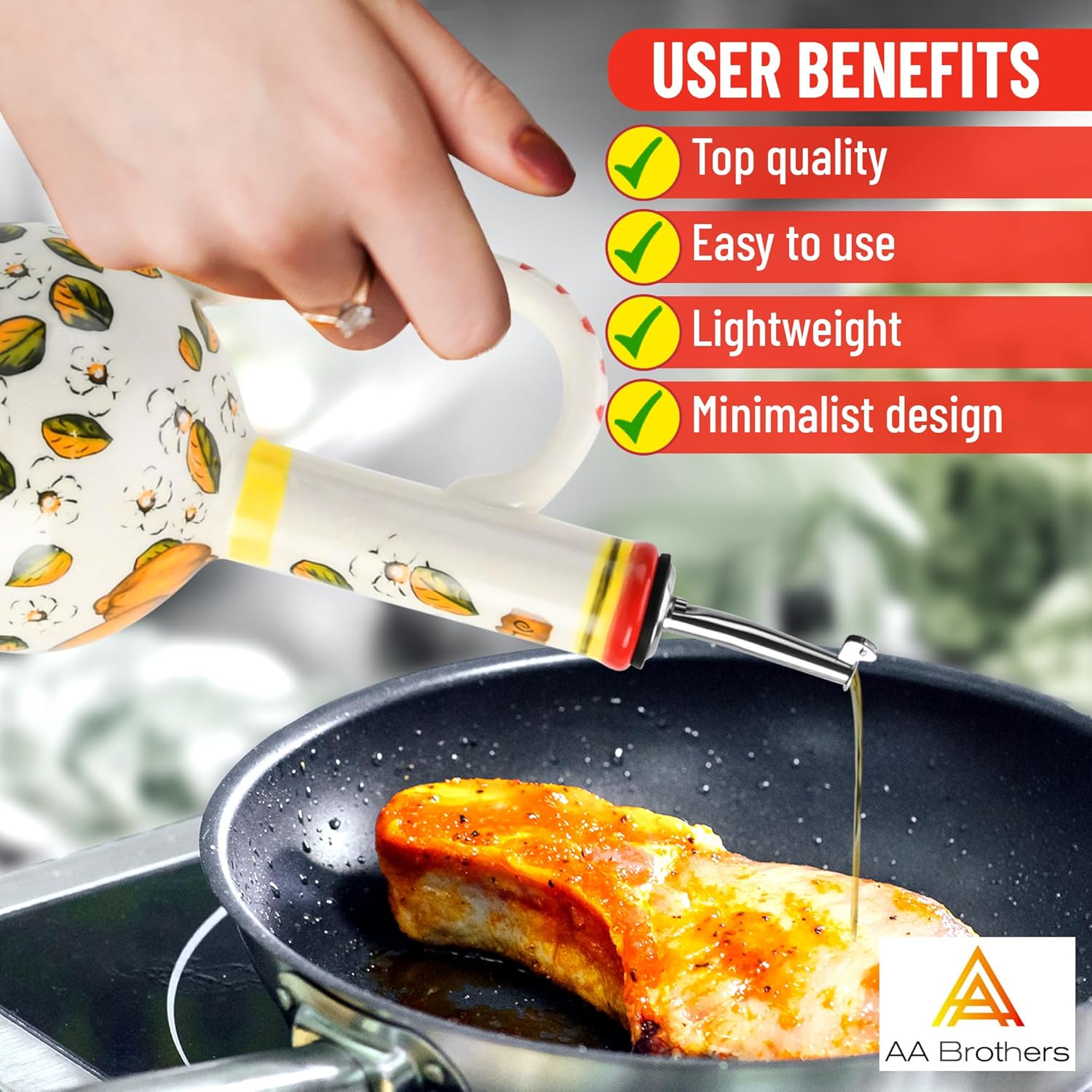 - Crafted With Ceramic: Each stoneware olive oil dispenser is made using durable and smooth ceramic that’s handcrafted and hand painted into a cruet bottle to keep your olive oil protected from UV rays, fresh, and ready to use while helping keep dust and bugs out