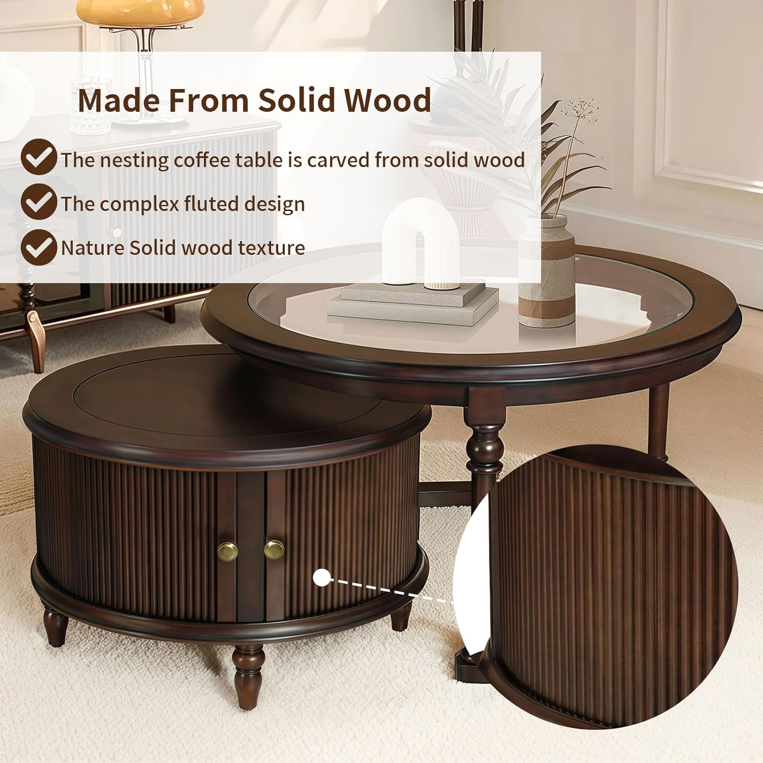 31.5'' Nesting Coffee Table Set of 2, Solid Wood Round Nesting Coffee Table Fluted with Storage, Brown Modern Coffee Table Set for Living Room Office