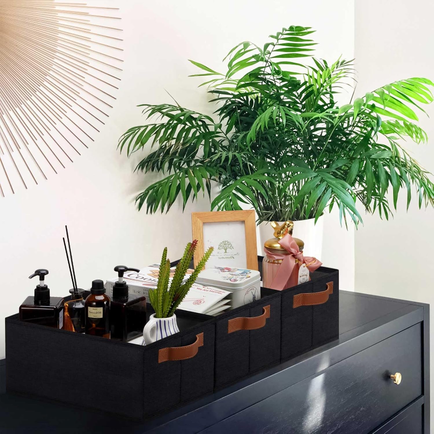- 👍【QUALITY MATERIAL】Storage baskets for shelves are made of high-quality cationic fabric and polyester cotton fabric, and the inner layer is made of non-woven fabric, which is odorless, long-lasting and strong. Classic faux leather handles that adds a comfortable touch and provides a strong and comfort grip to pull and move. Fabric storage bin is easy to clean, just wipe with a damp sponge or cloth