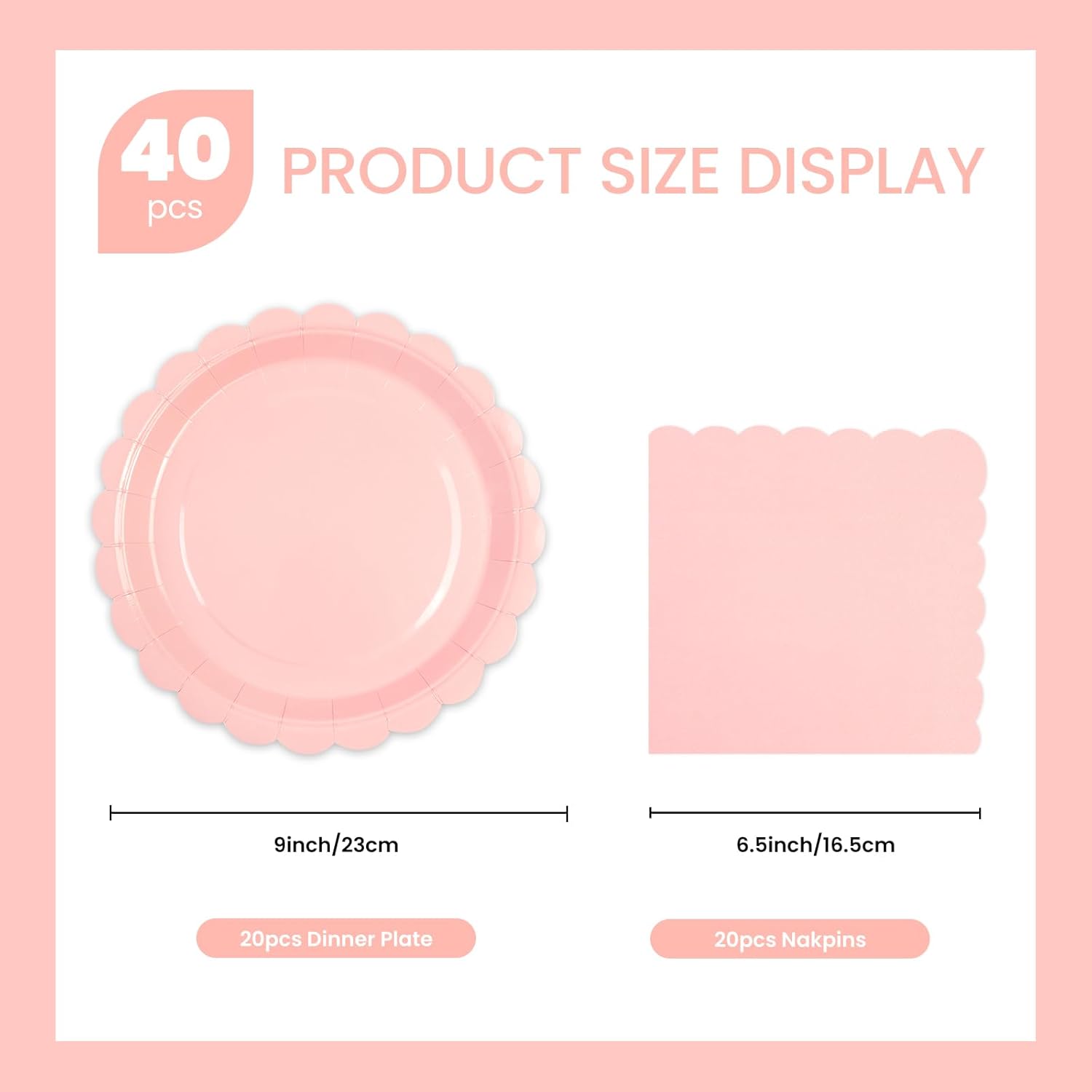 - Complete Set: Enjoy a hassle-free party with our 50 pcs pink scalloped paper plates party supplies set that includes9 inch 20 pcs dessert plates & 20 pcs napkins.Perfect for any party or everyday use, enough to decorate a fabulous and unique party!
