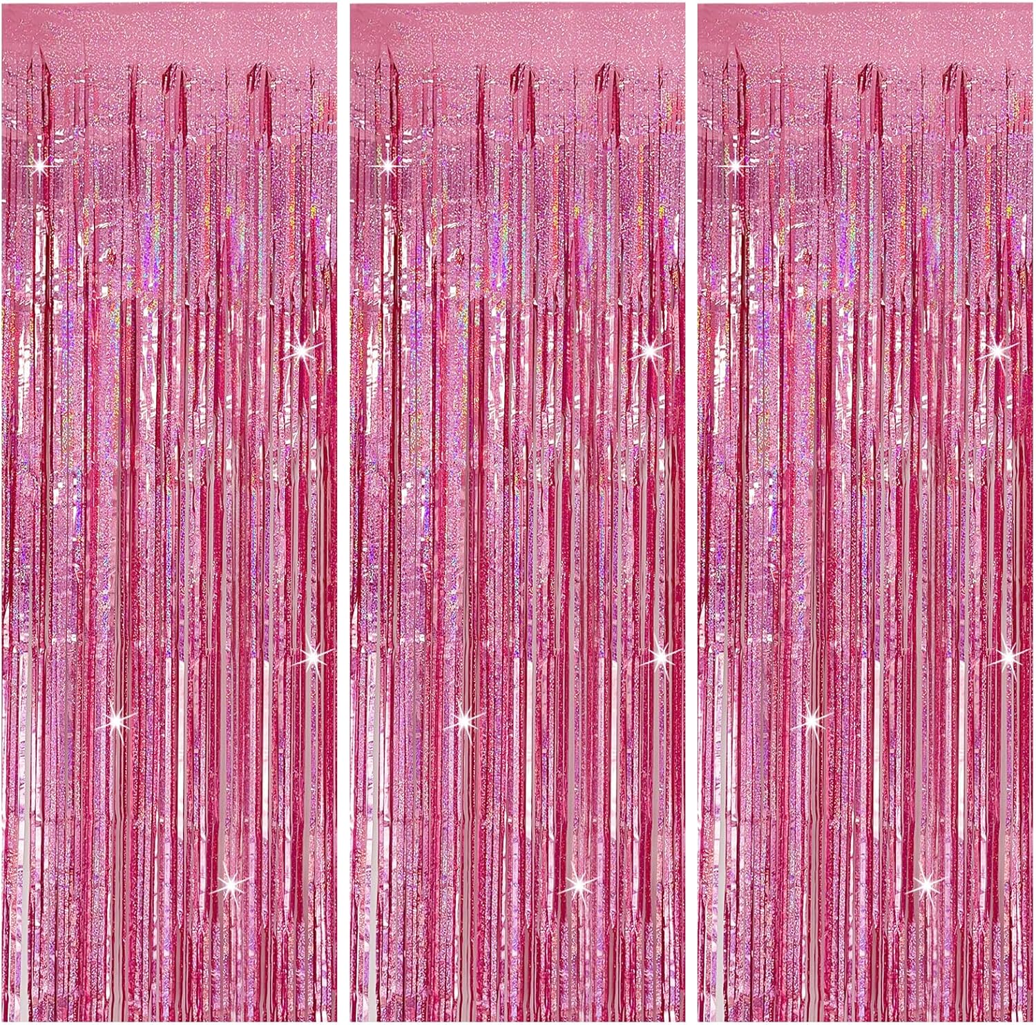 - Pink Decorations for Party:3 packs of foil fringe curtains, the size of the foil curtain is 3.28 ft x 6.56 ft.It's long enough to fit any occasion.Please do not stick the foil curtain on uneven or stained walls to prevent it from falling off.