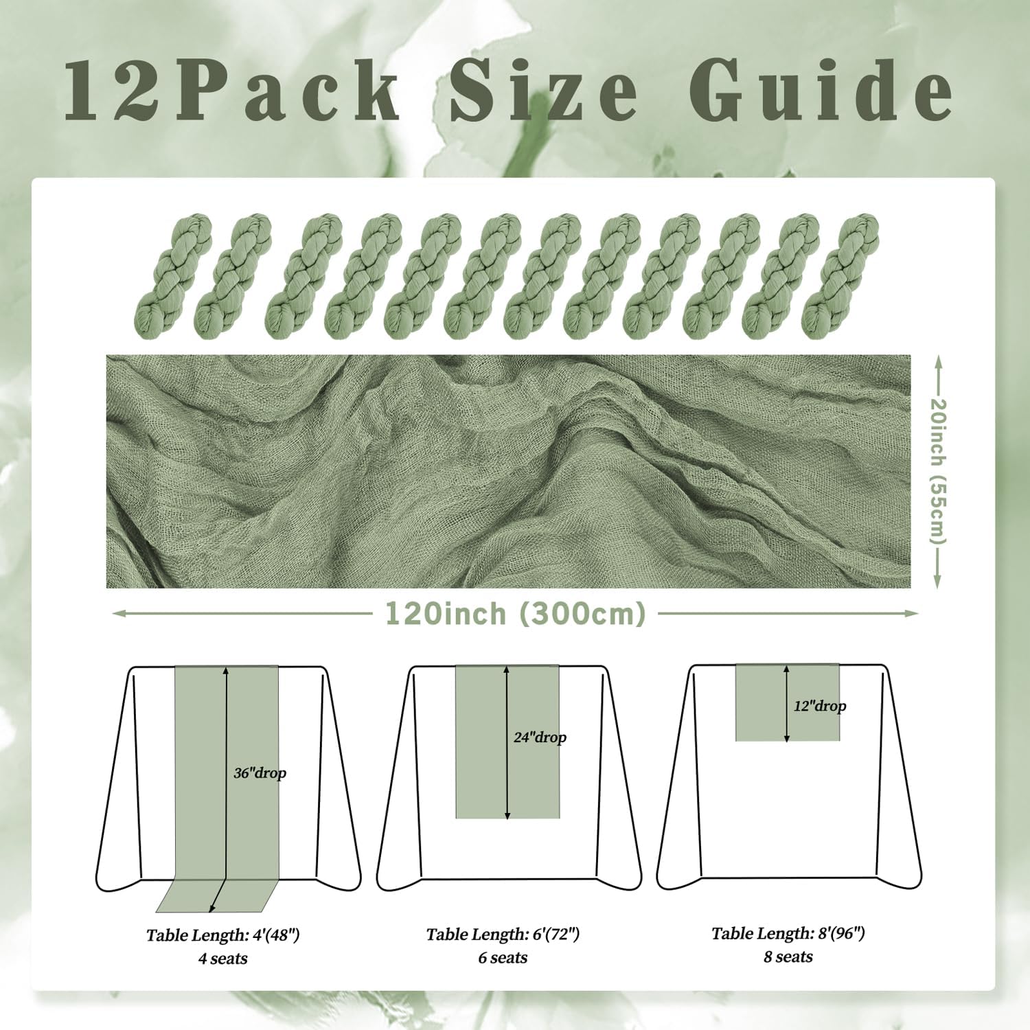 - Cheesecloth Table Runner Size: You will receive 12 sage green cheesecloth tablerunner, each measuring 20 x 120 inches. The quantity is sufficient for you to decorate various romantic occasions. It can decorate most shaped tables, such as rectangular tables, round tables, and cocktail tables. It is long enough to decorate a large table and be placed perfectly and elegantly on the tabletop, adding a romantic atmosphere to your occasion.