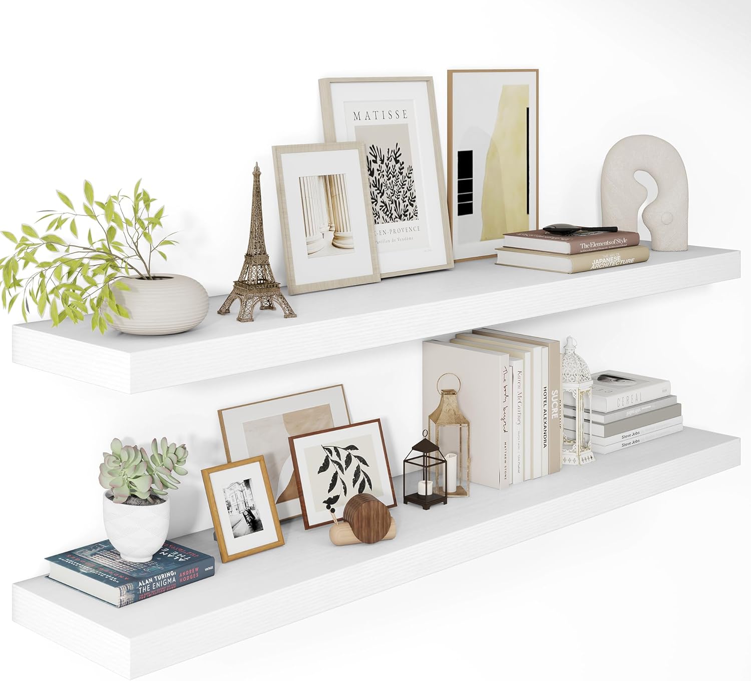 White Floating Shelves for Wall, 48 Inch X 12 Deep Shelves for Room Wall Mounted,2" Thick Heavy Duty Holds 75lbs Floating Shelf for Bedroom Bathroom Kitchen Laundry Room, Set of 2