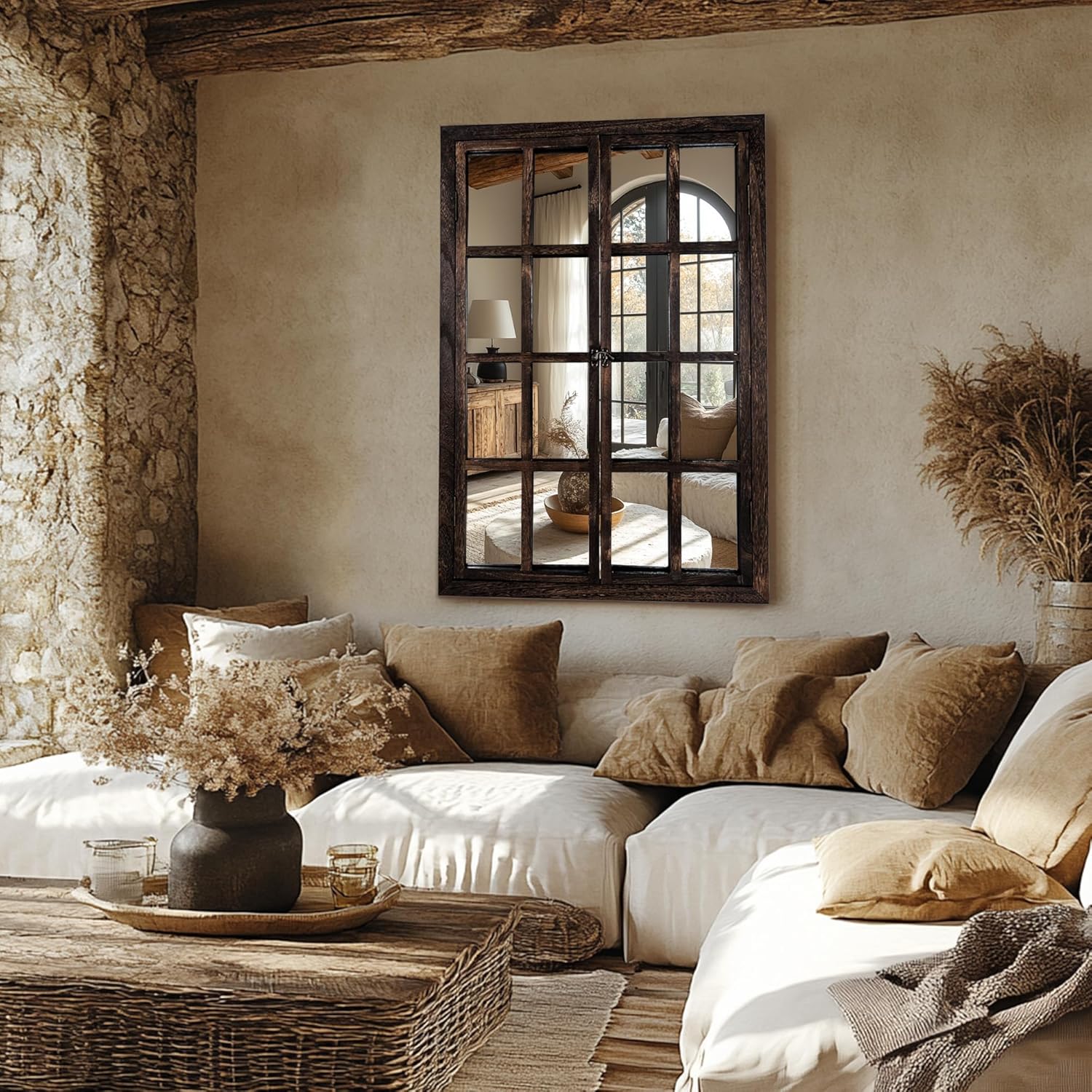 Wall Mirror with Window Design, 38"x26" Rustic Farmhouse Wood Mirror for Wall Decor, Decorative Vintage Mirror for Living Room, Bedroom, Entryway