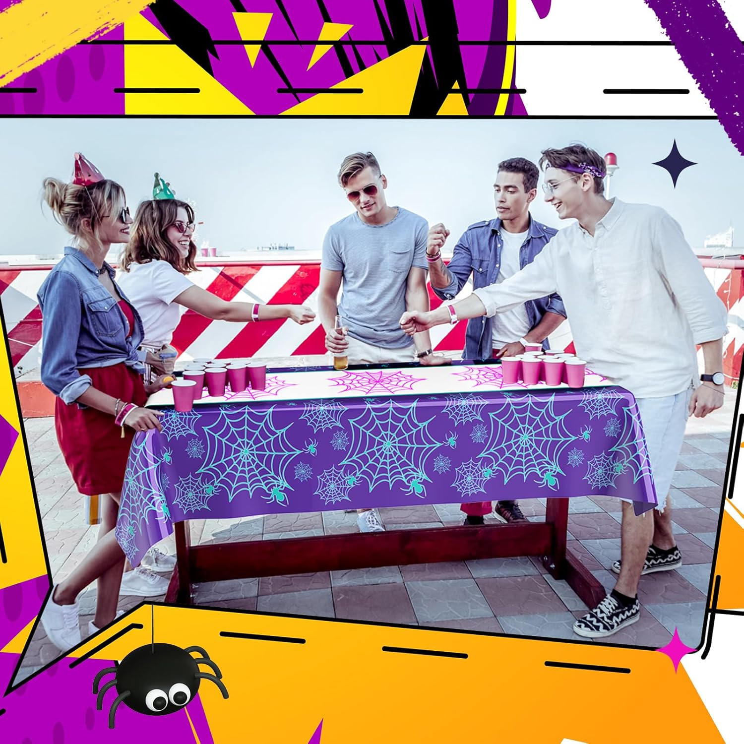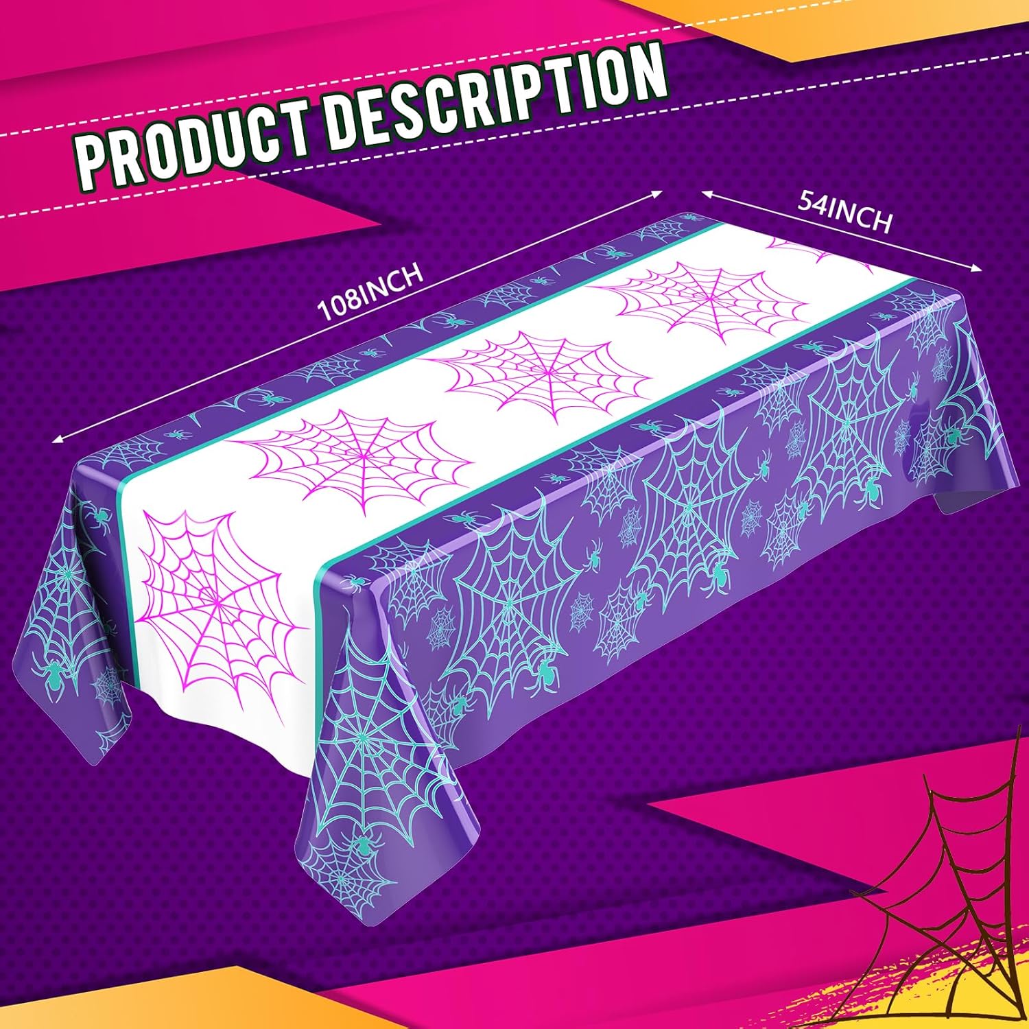 - Vibrant Design: featuring vibrant prints of spiders and webs, these tablecloths embody a strong cartoon spider vibe; The clear and realistic purple spider design makes them the ideal decoration for spider birthday parties, anniversaries, retirement parties, family gatherings, Hawaiian parties, and even Christmas parties