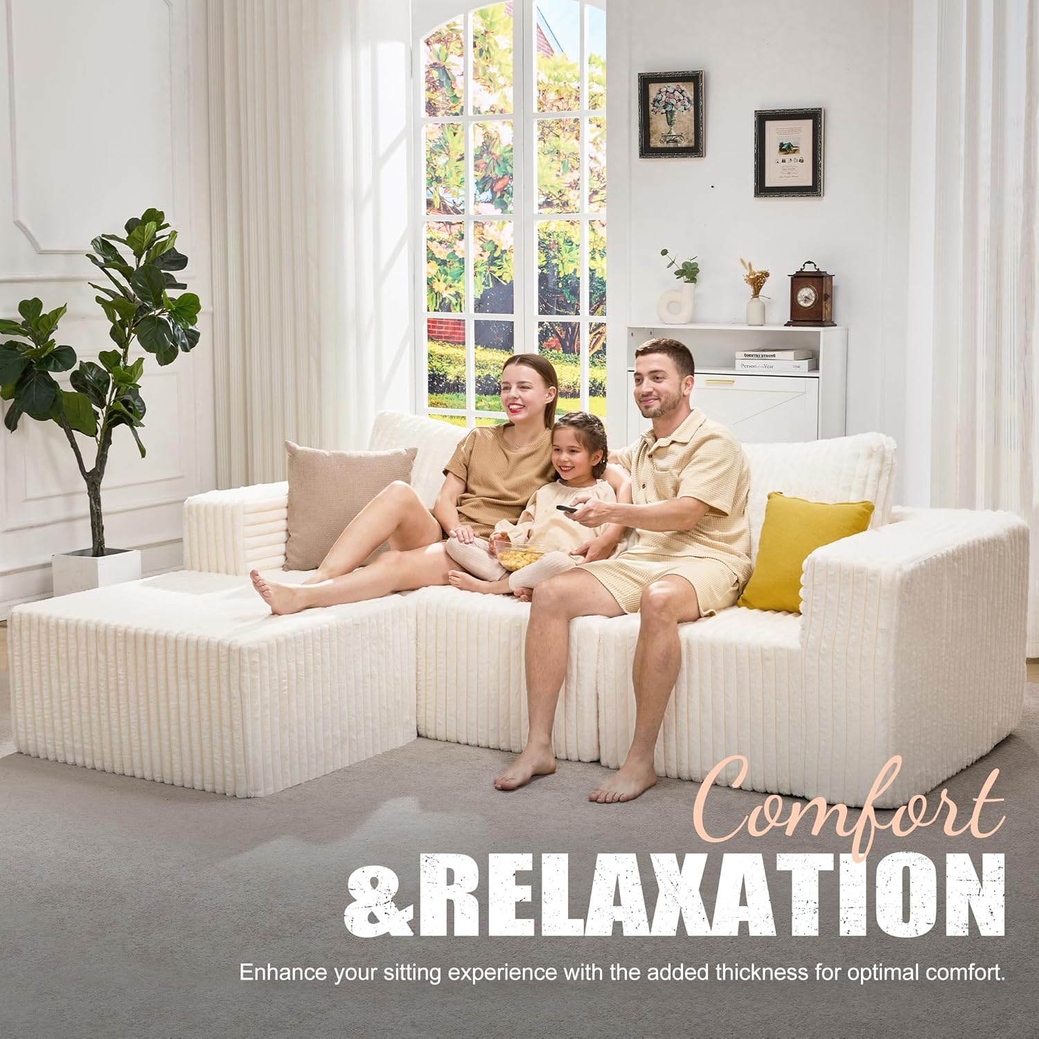 Hobestluk Modular Sectional Sofa Memory Foam Couch Oversized Sectional Sofa 3-Seater with Chaise Cloud Couch with Removable Cover L Shape Sofa for Living Room (Strip White, 3-Seater with Chaise)