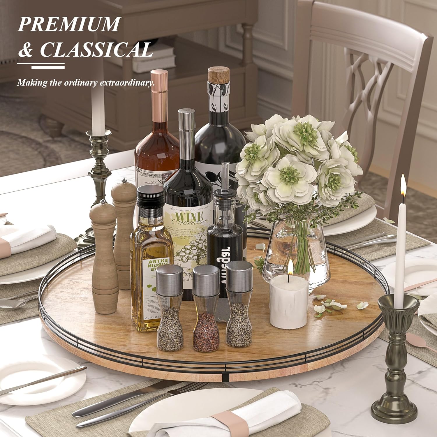 - UPDATED DESIGN: With larger wood base on this lazy Susan for table top, the turntable organizer doesn't wobble, even with heavier items on it. With premium oak wood and classical iron fence make this lazy Susan turntable stylish, functional and adding a touch of rustic charm. itβs also very easy to clean. There are included anti-slip pads on the bottom of the lazy Susan for extra surface protection.