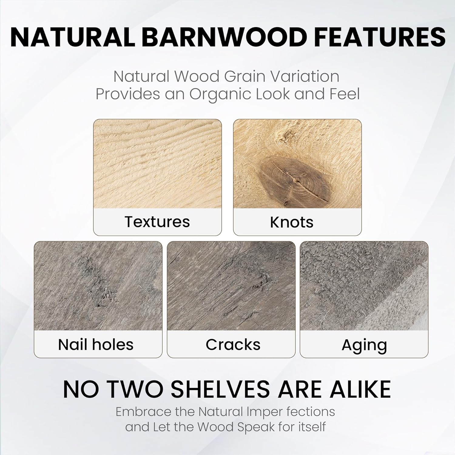 - Thick Reclaimed Wood Shelves: Fun Memories floating shelves are handcrafted from 1.4" thick solid reclaimed wood, measuring 40" x 8". Natural barnwood features—such as nail holes, discoloration, and surface wear—make each shelf a one-of-a-kind, authentic décor accent