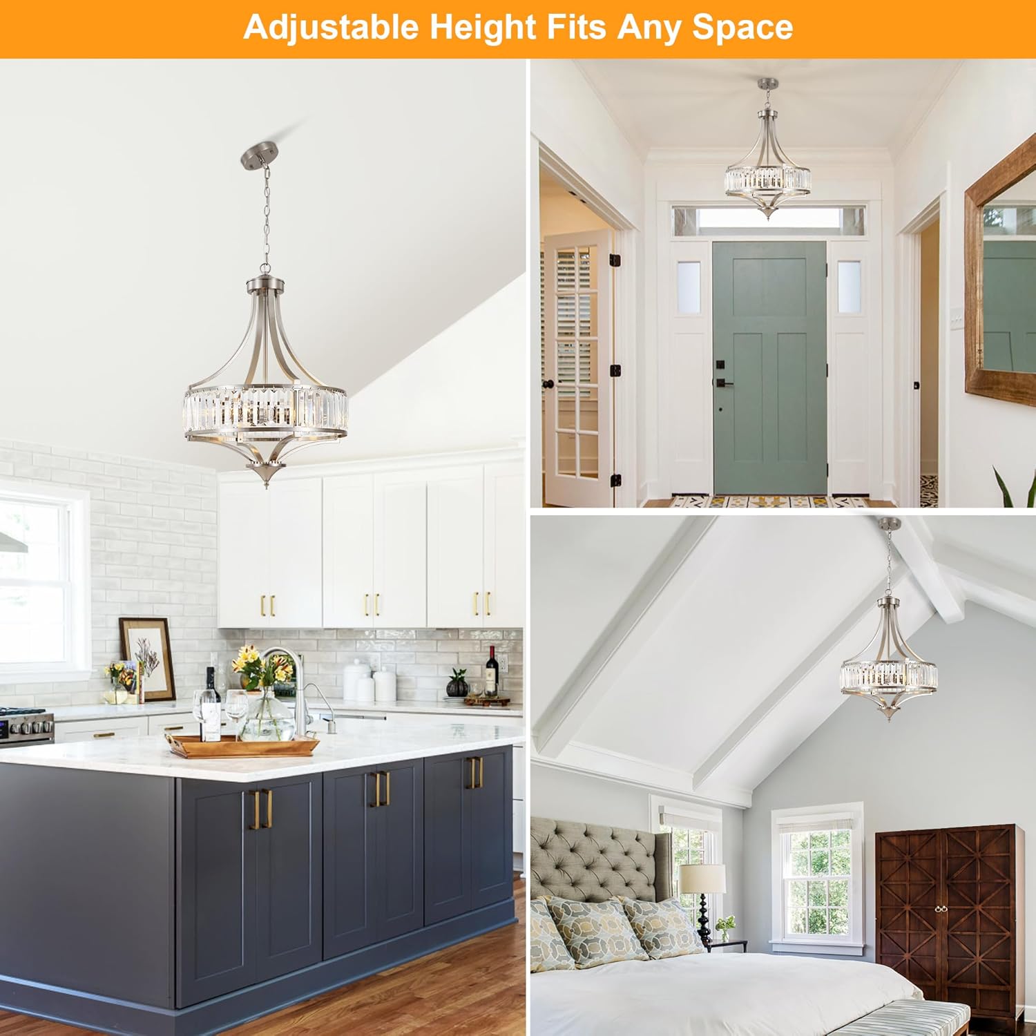 • Modern Farmhouse Style: Brushed nickel crystal chandelier is crafted by skillful artisans. The crystal strips in the main part are skillfully arranged to form an elegant circular structure. Whether it is in the common living room where you spend time with your loved ones, the dining room where you enjoy cooked meals, the chic chandelier fits right in to light up every moment spent inside the comfort of your home.