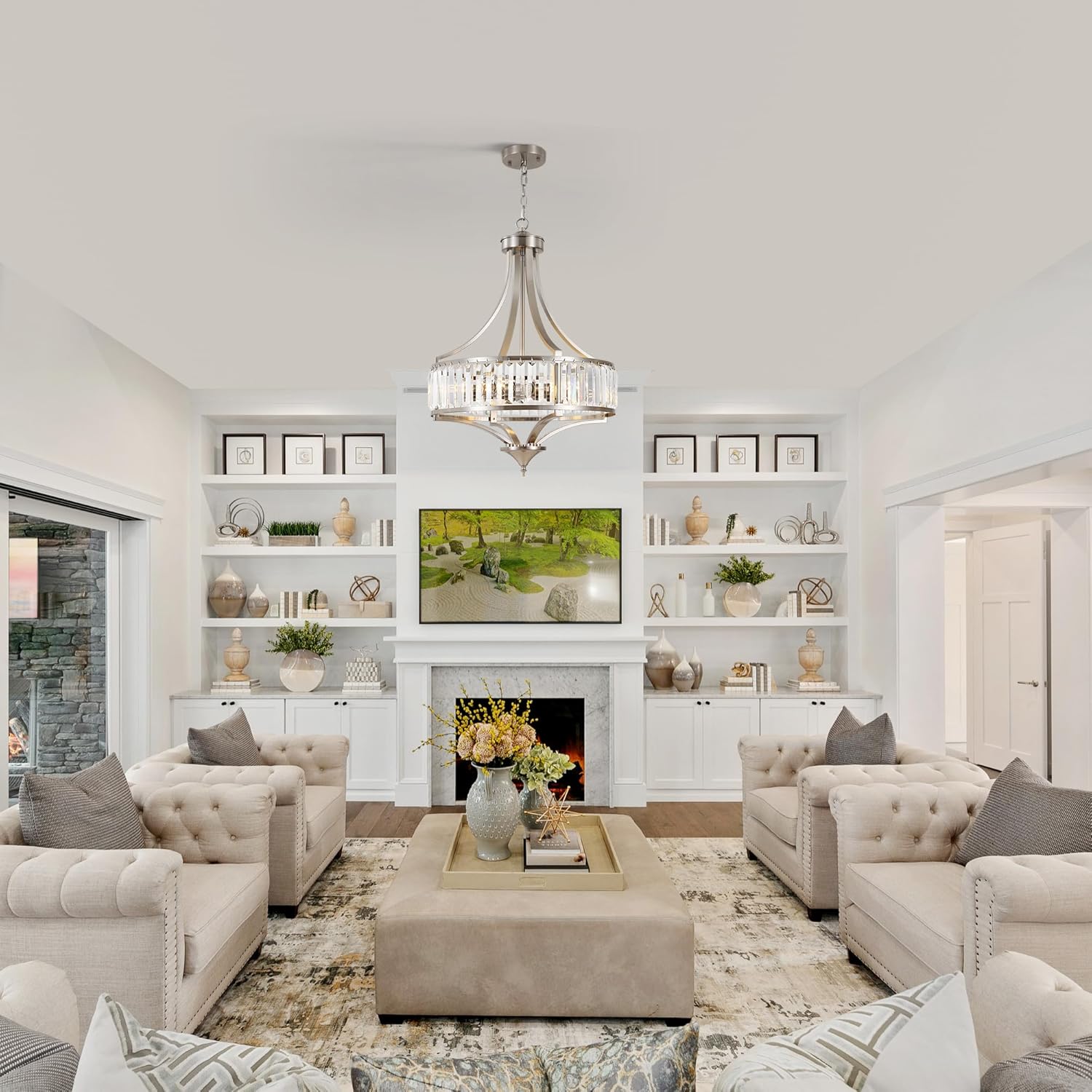 20" Brushed Nickel Chandeliers for Dining Room, 5-Light Modern Crystal Chandelier for Entryway, Hanging Round Light Fixture for Kitchen Island Living Room Bedroom Office Bathroom Staircase