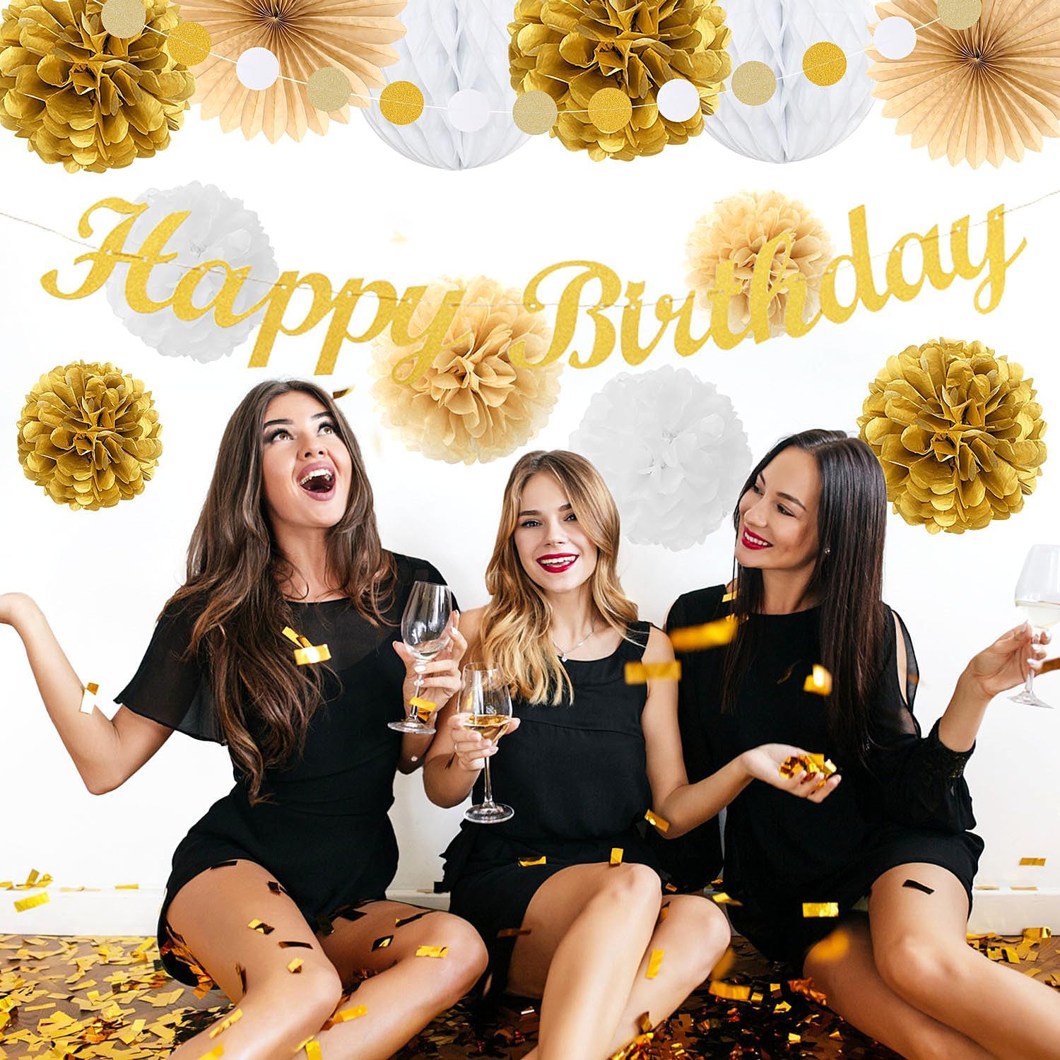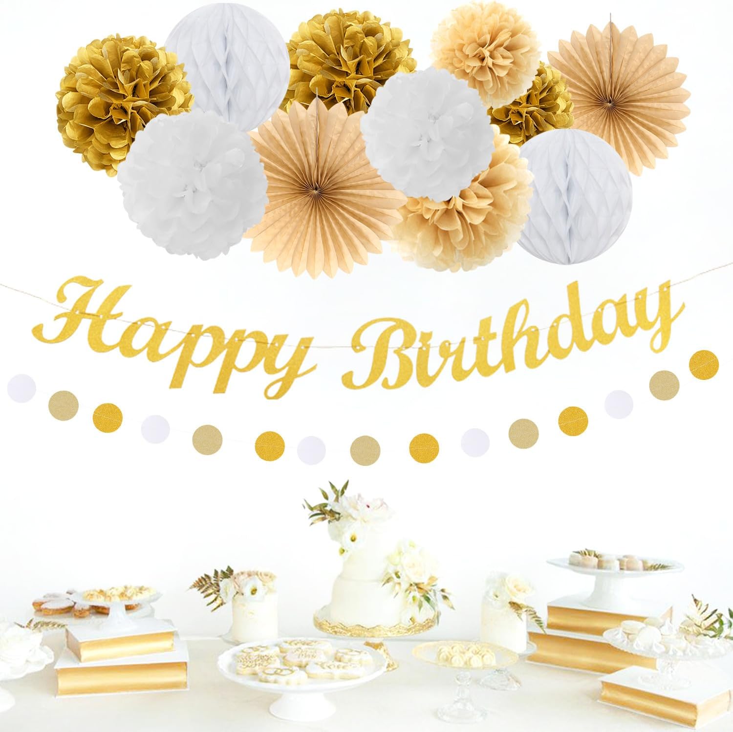 White-Gold Champagne Birthday Party-Decorations Paper-Flowers - 14pcs Happy Banner Engagement Honeycomb Tissue Pom Poms,Women Streamers Garland Beige Fans,21st 18th Girl Hanging Supplies Decor Hugfond