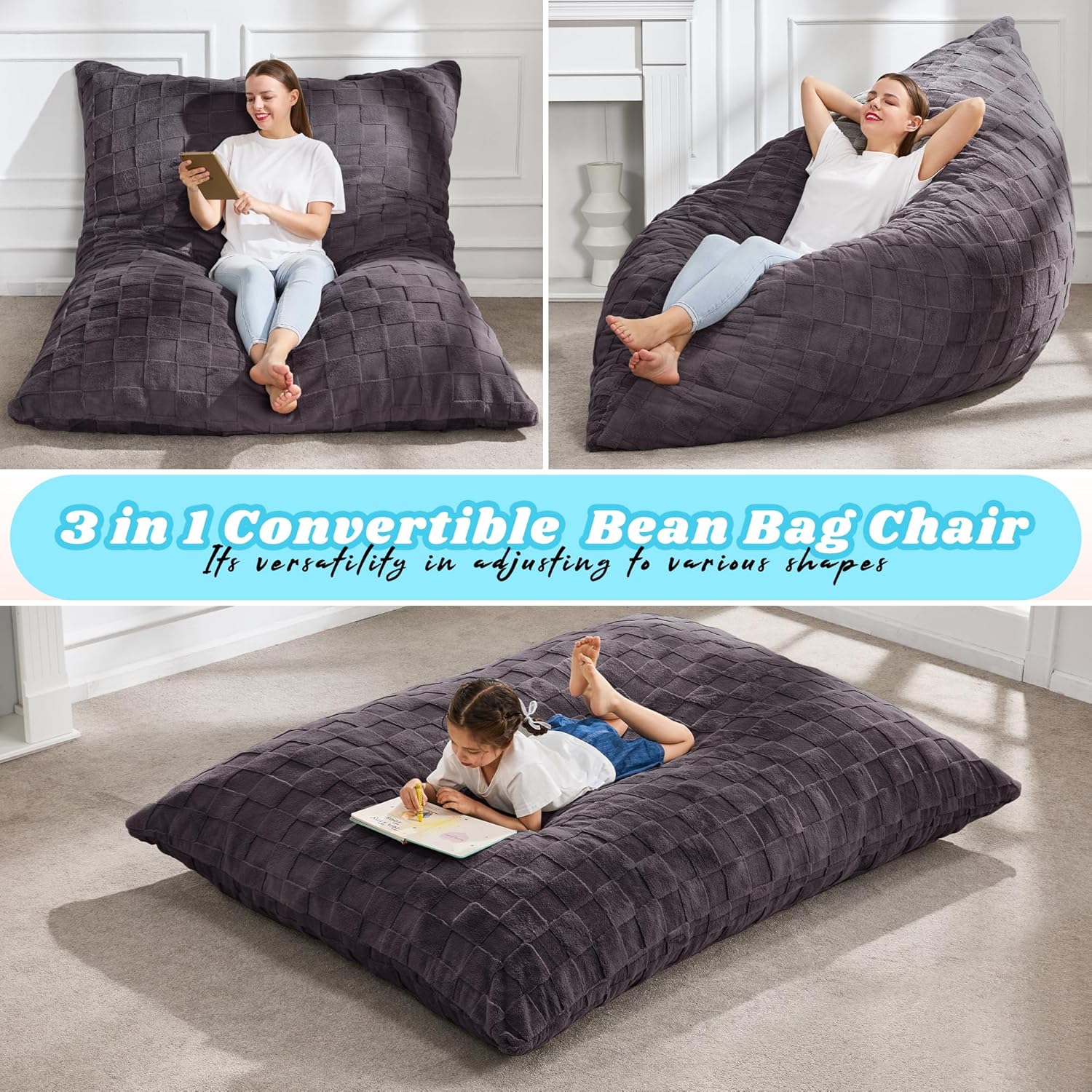 Hobestluk 3 in 1 Bean Bag Chair Giant Bean Bag Chairs for Adults with Plaid Cover Convertible Bean Bag Floor Cushion with Machine Washable Cover for Living Room (Plaid Dark Grey)