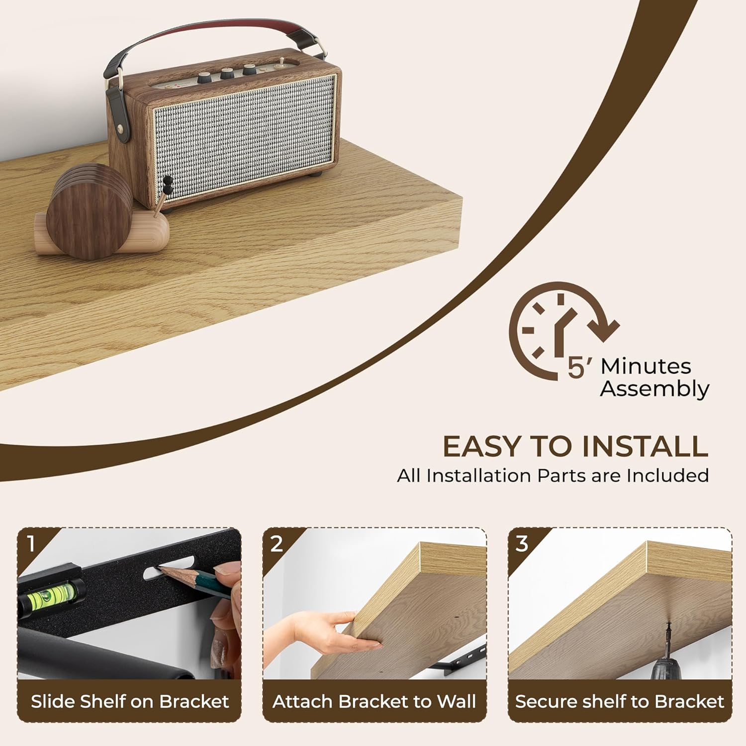 RICHFOCUS 40Inch Floating Shelves for Wall 2 Pack Shelves for Bedroom|Kitchen|Bathroom Wall Mounted Rustic Wood Floating Shelf with Invisible Brackets for Books|Storage|Decor, Oak