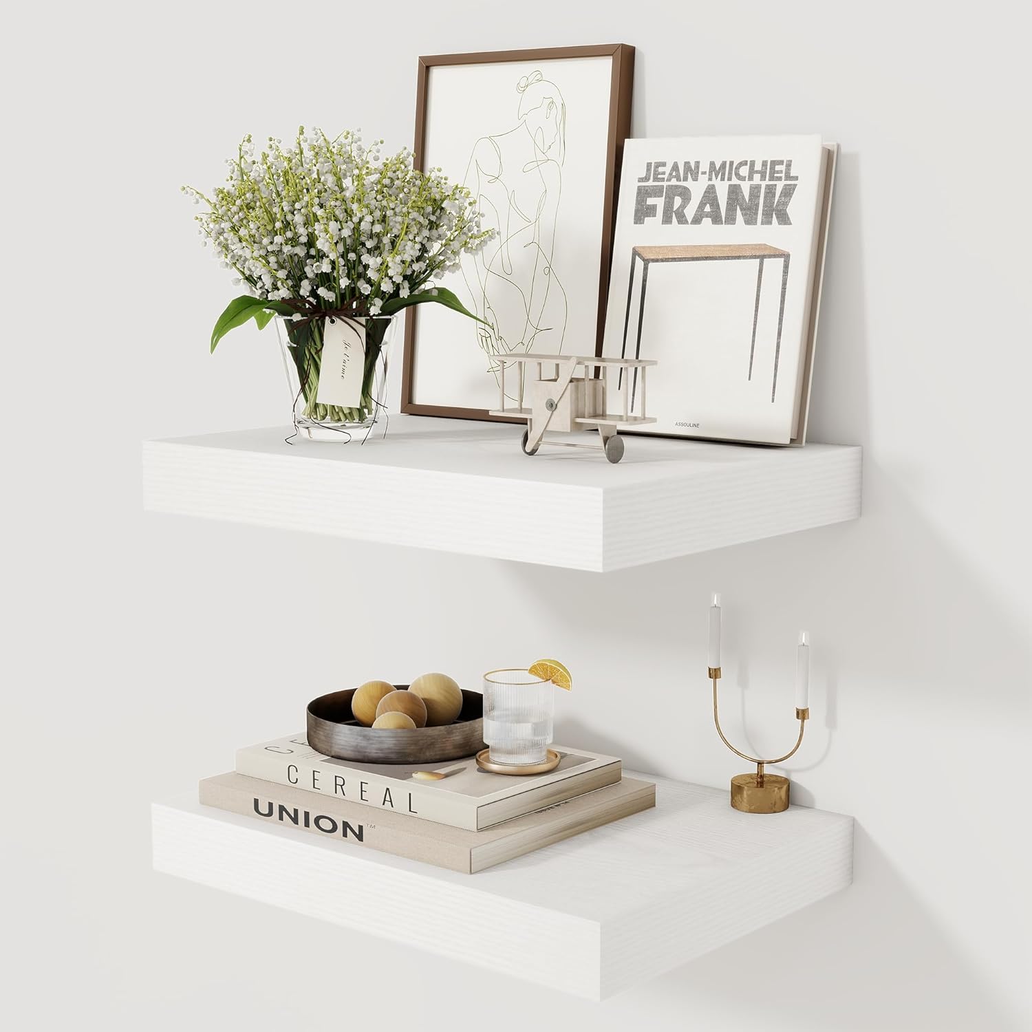 • 【FARMHOUSE RUSTIC WALL SHELF】These floating shelves are made of premium engineered wood board and invisible one-piece bracket. The rustic wooden grain surface add character and warmth to any modern or traditional interior with these thick floating shelves, contrast shelves at staggering heights on the wall or mount side-by-side or in the corner for a clean streamlined look.