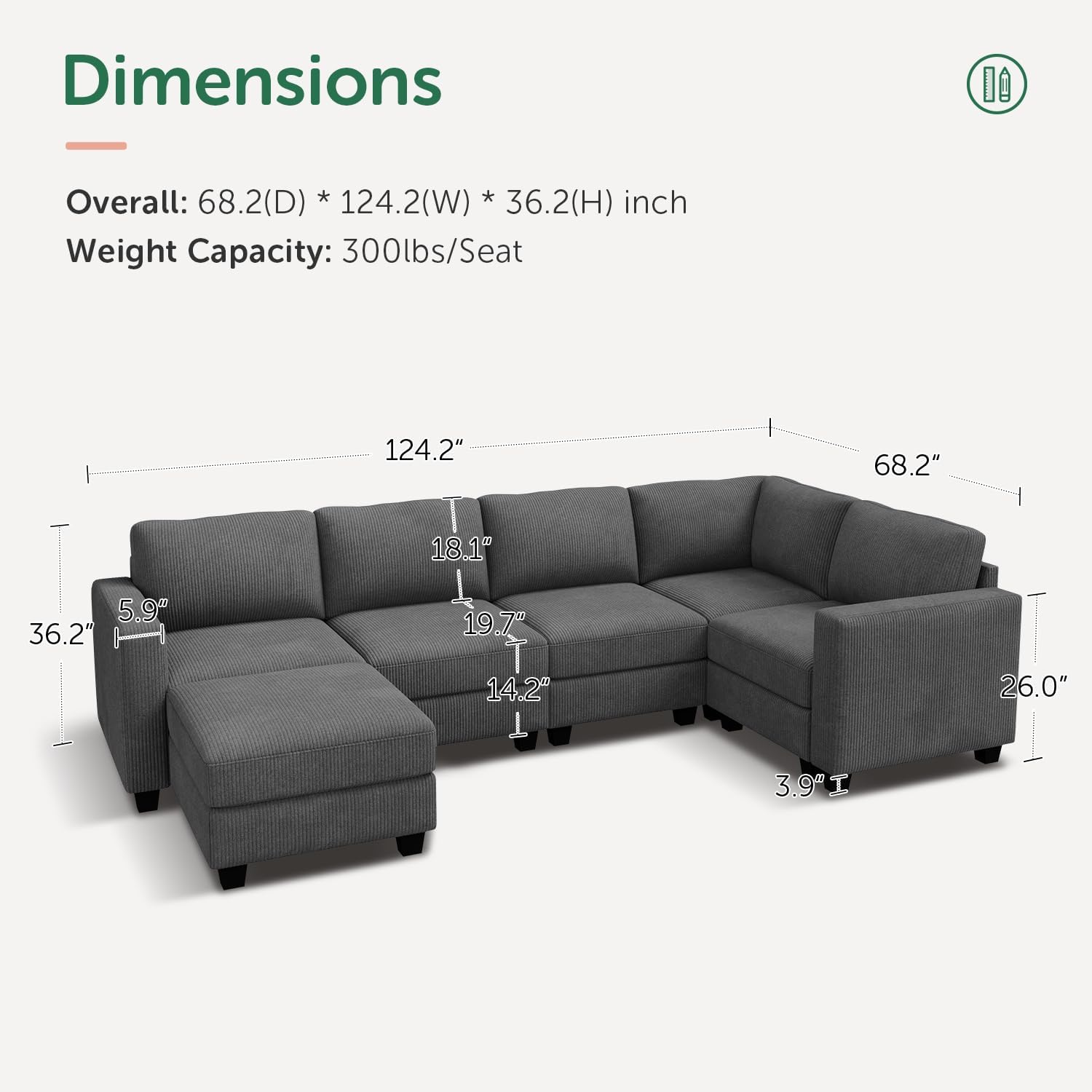 HONBAY U-Shaped Corduroy Sectional Couch with 6 Seaters Modular Sectional Sofa with Storage Sectional Couches for Living Room, Dark Gray