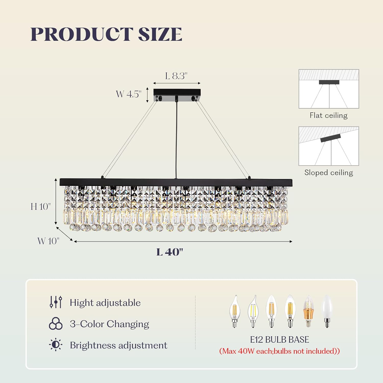 • IDEAL SIZE & ADJUSTABLE HEIGHT: This K9 chandelier measures L40" x W10" x H10", a perfect size to illuminate dining tables or kitchen islands without overwhelming the space. The hanging wires are adjustable up to 59", allowing you to set the perfect height on flat or sloped ceilings for a tailored fit in dining rooms, kitchens, living rooms, and more.