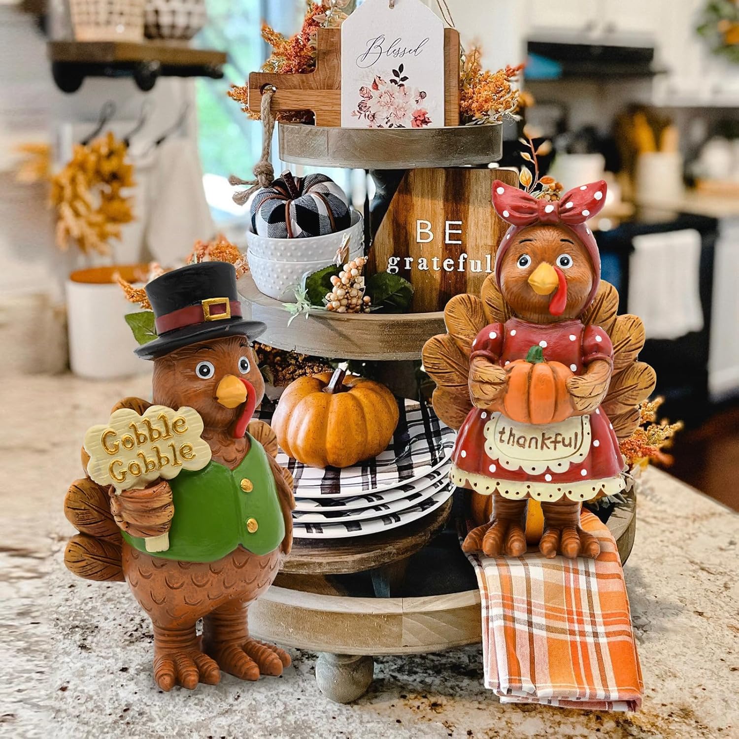 Thanksgiving Turkey Decor - 2Packs Resin Turkey Couple Standing Figurines Thanksgiving Decorations- Fall Decor Indoor for Tables Centerpieces Harvest Farmhouse Kitchen